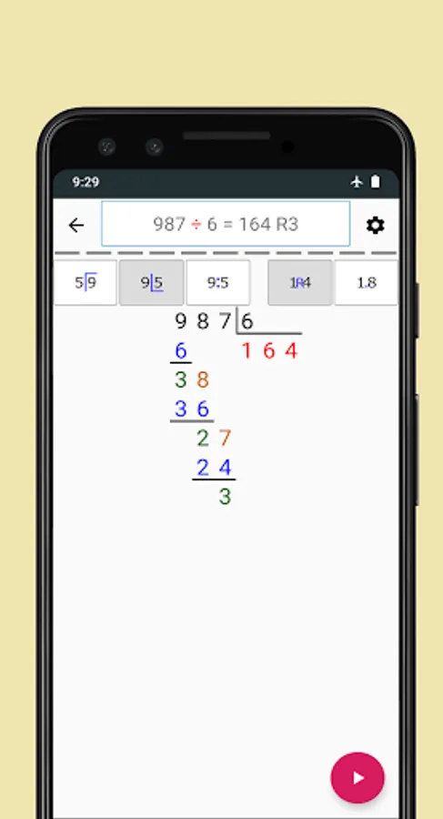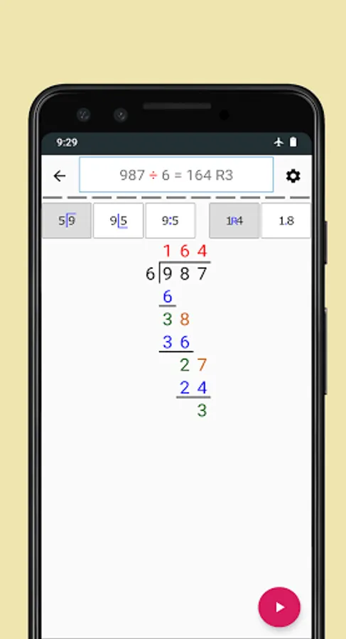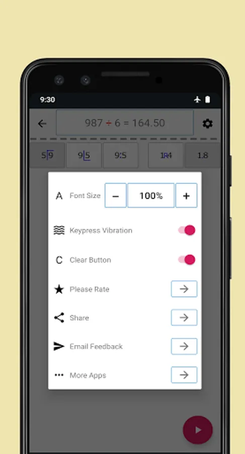 First you can choose between remainder mode or decimal mode. In remainder mode, you will get the answer with remainder. For example 9 divide by 5 the answer will be 1 R4 while for the same numbers in decimal mode you will get 1.80 as an answer.