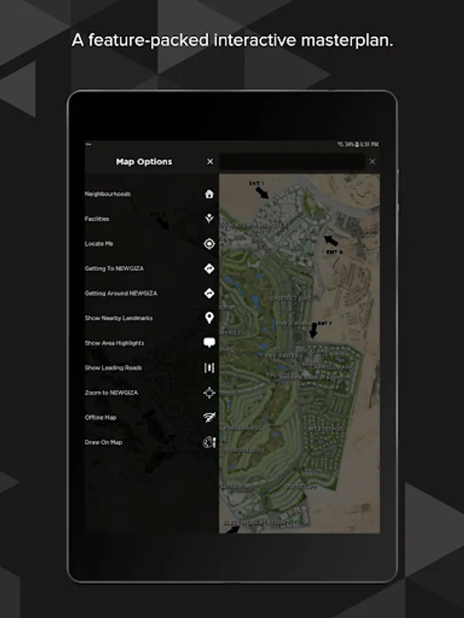 2- View within the map neighbourhoods, facilities, all roads leading to NEWGIZA, project entrances, and nearby landmarks.