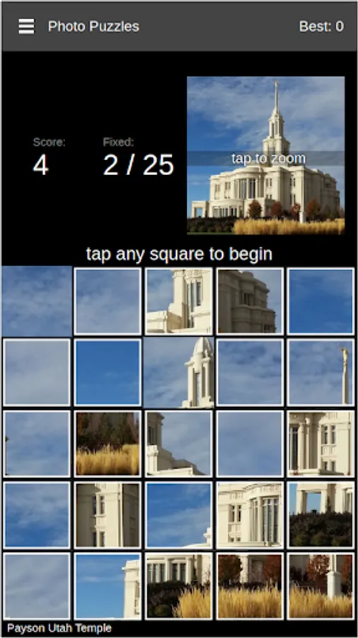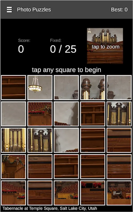 Photo Puzzle is a tile puzzle similar to a jigsaw puzzle but with square pieces. A picture is broken into squares that are then jumbled. Select two squares to switch their positions. Continue until the puzzle is solved. Points are scored for the number of pieces moved to their correct position. Puzzles with more pieces are easier but you cannot score as many points.