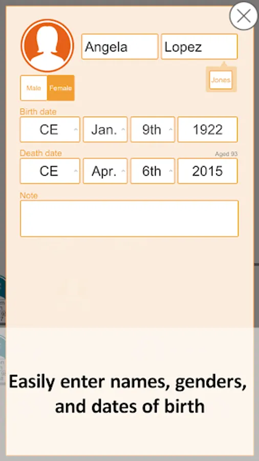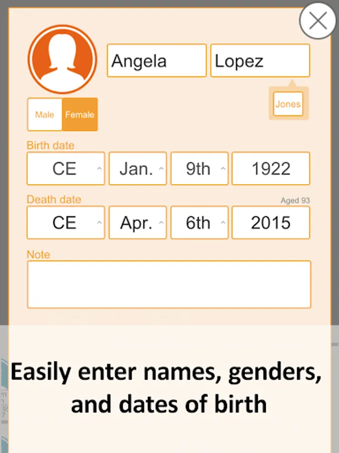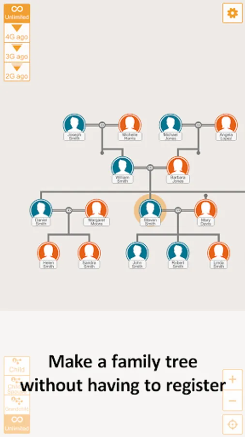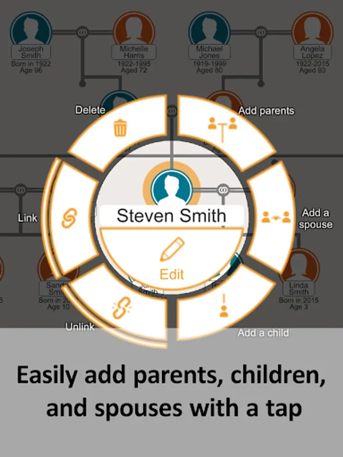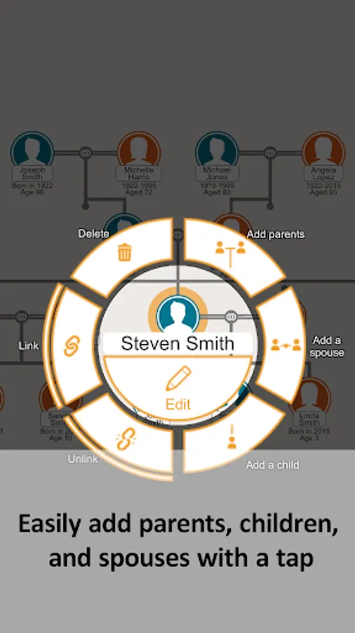 You can easily add parents, children, and spouses just by tapping. Family trees can be created intuitively. The display order of siblings can also be easily changed through drag and drop.