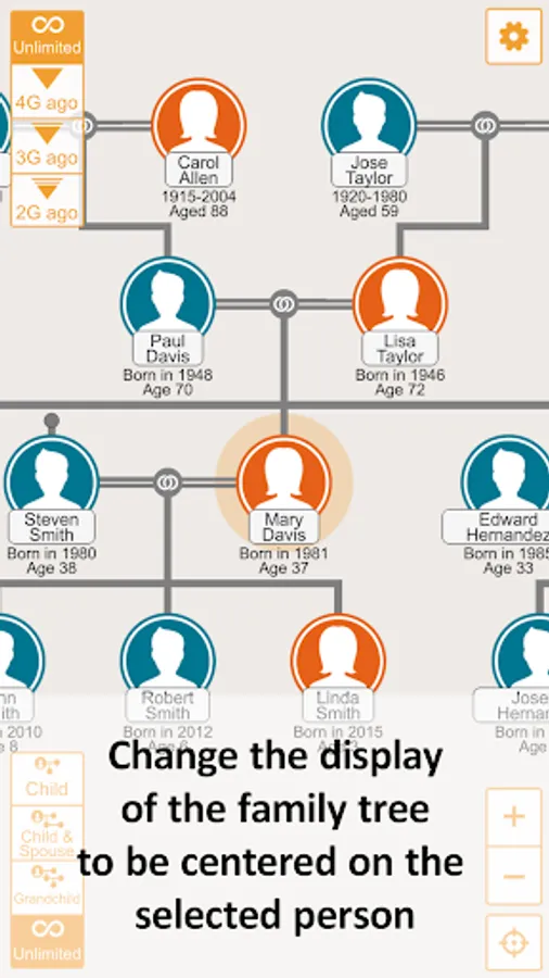 The display changes automatically so that the person selected appears in the center. You can make complex family trees look simple and easy to understand.