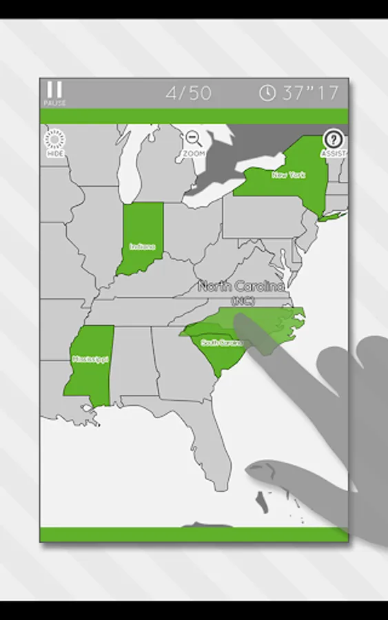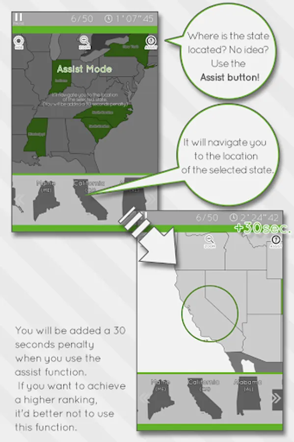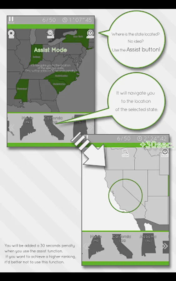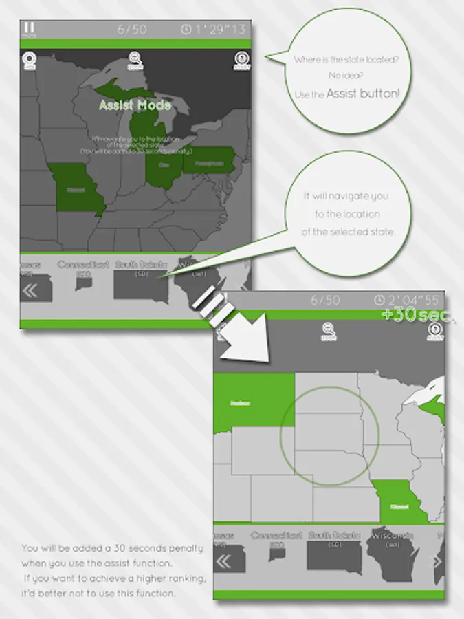 When you're stuck on finding the location of a state, use the [Assist] function. It will help you to navigate the correct location without hassling yourself.