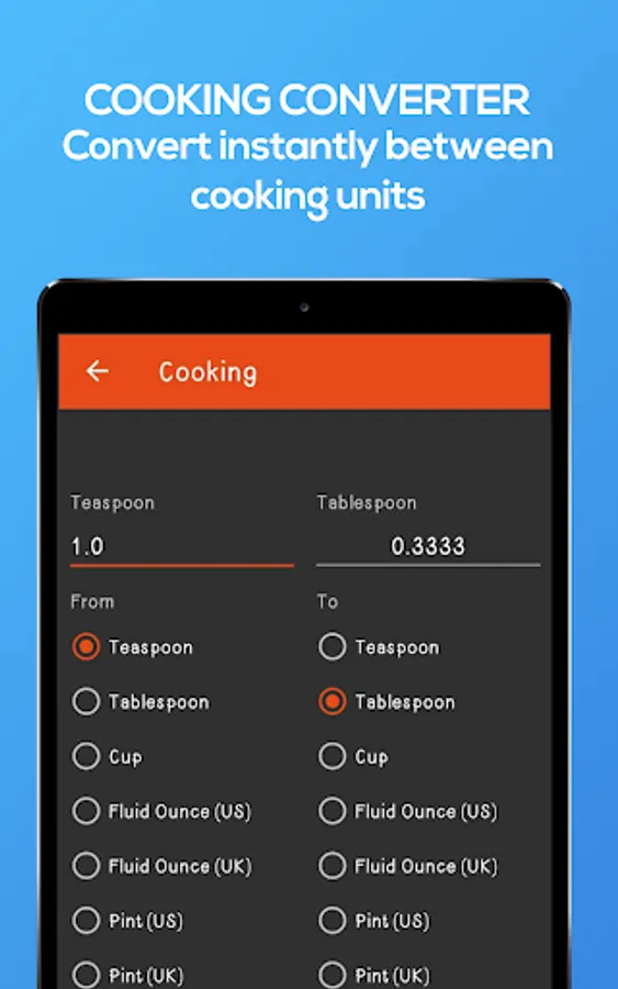 Seamlessly convert Teaspoon, Tablespoon, Pint, Gallon and Fluid Ounce (UK/US) – great for international recipes and home use.