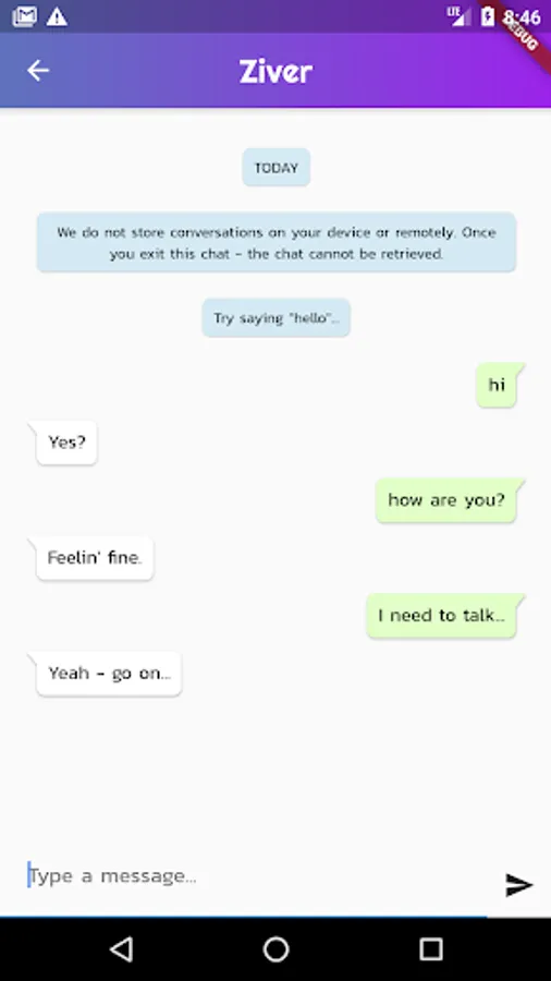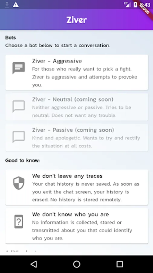 Choose from different chat bots to suit your current mood, and exit whenever you're feeling better about things - Ziver is always online if you need to come back.