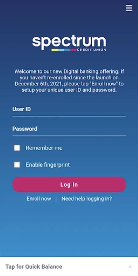 Note: Login credentials established prior to December 6, 2021, are no longer active. New and existing users must tap Enroll Now to set up a User ID and password.