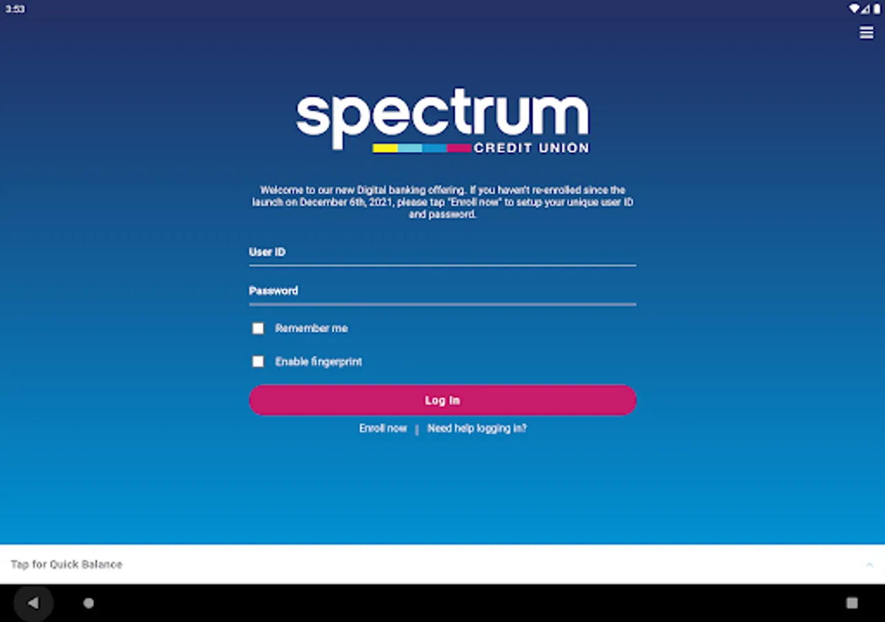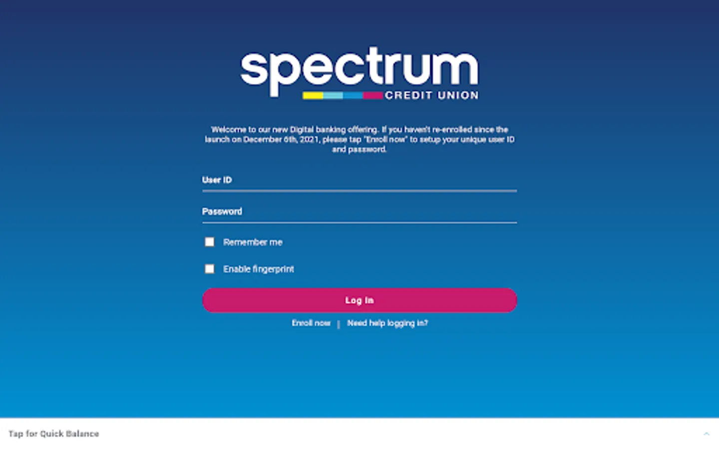 Welcome to Spectrum Credit Union Mobile Banking! Some exciting updates to our app include a streamlined look and feel, features to make moving money easier, and a simplified login process for members with multiple memberships.