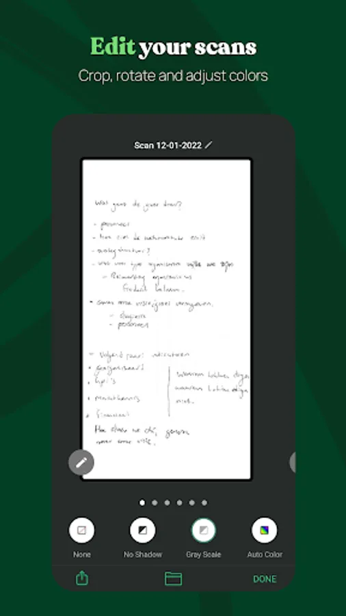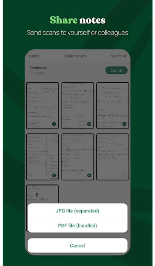 - Share your scans as a .JPEG or bundled PDF file.