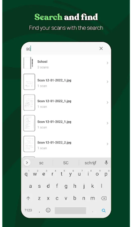 - Search bar: easily locate scans by performing a search request on the name or date of the scan