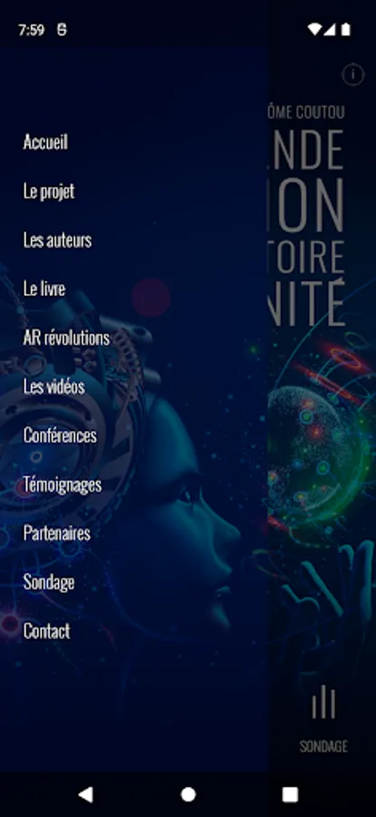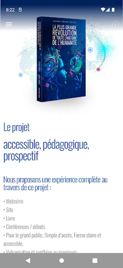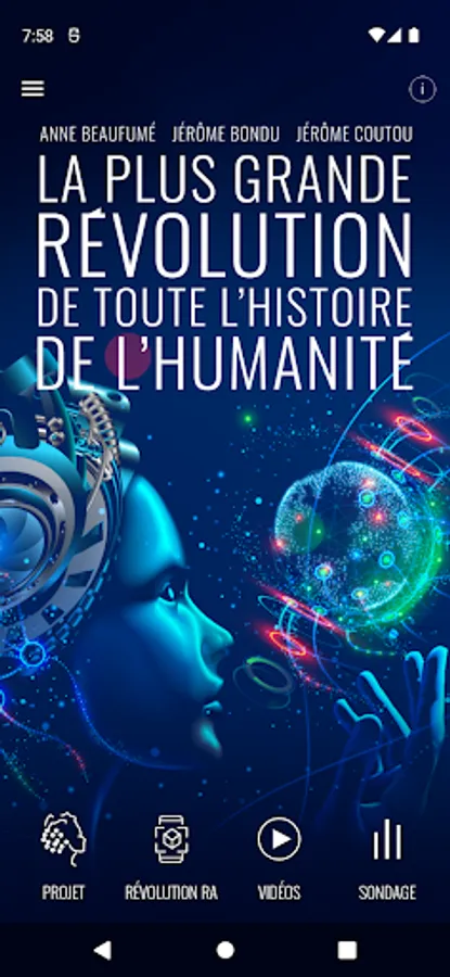 Application of the project "The greatest revolution in all of human history" integrating Augmented Reality for the book, the survey of the most important revolutions, information about the project and interviews.