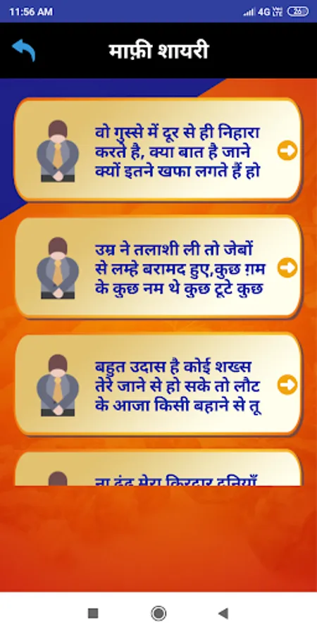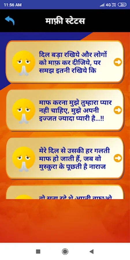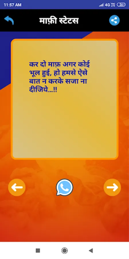 Maafi Shayari & Sorry Status app has user-friendly interface and big database..Now change your status daily with all sorry status and shayari app.We have the collection of unique and latest sorry statuses in hindi.