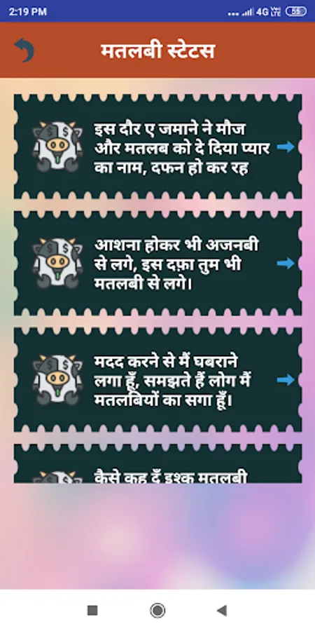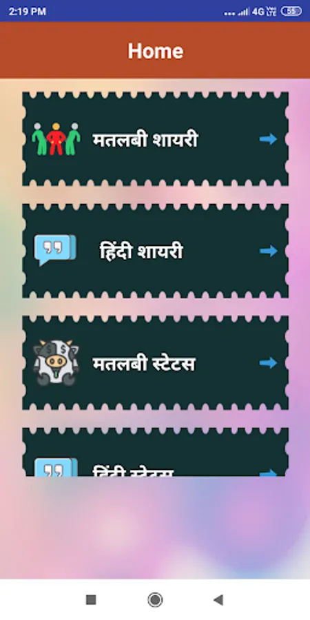Matlabi Shayari Status app is a great status application having various categories like Hindi,English and Other.
