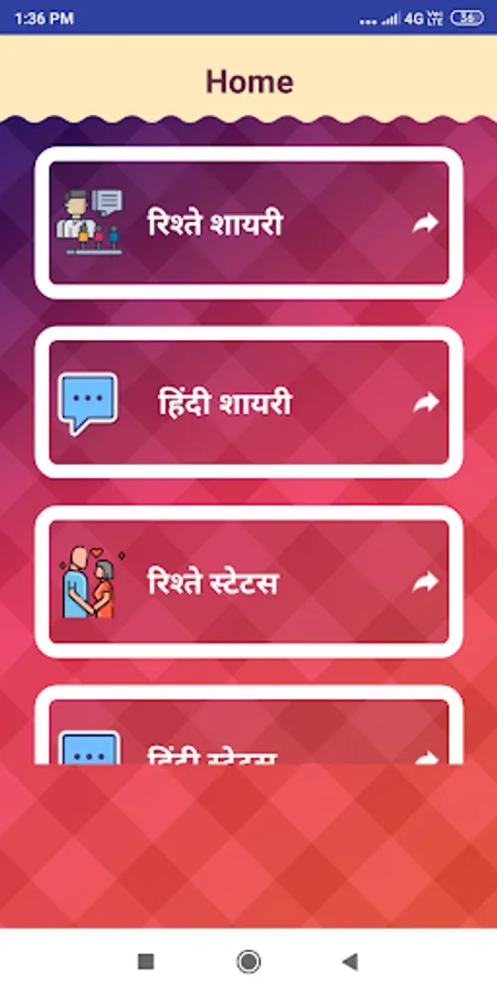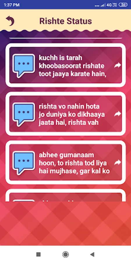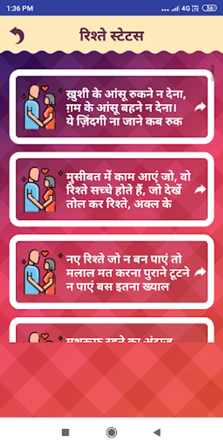 Rishte Shayari Status app is a great status application having various categories like Hindi, English and Other.