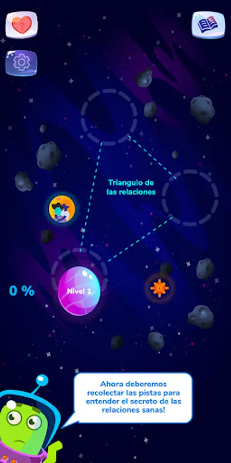 In this application you will play traveling through the universe exploring different worlds in search of healthy relationships. Along the way you will find various situations to reflect on the different types of relationships that exist, such as relationships or romantic relationships and friendship relationships. Thus, you will discover the three key elements of healthy love.