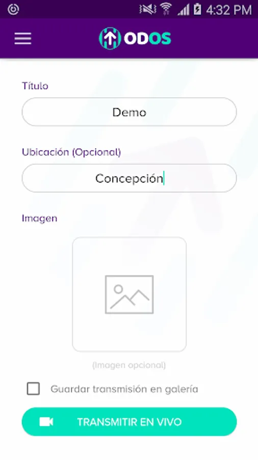 Create and broadcast your private events or field news live to the ODOS web platform. You can start, resume or stop your transmission from the App. Take captures or save transmission locally at the end of it.