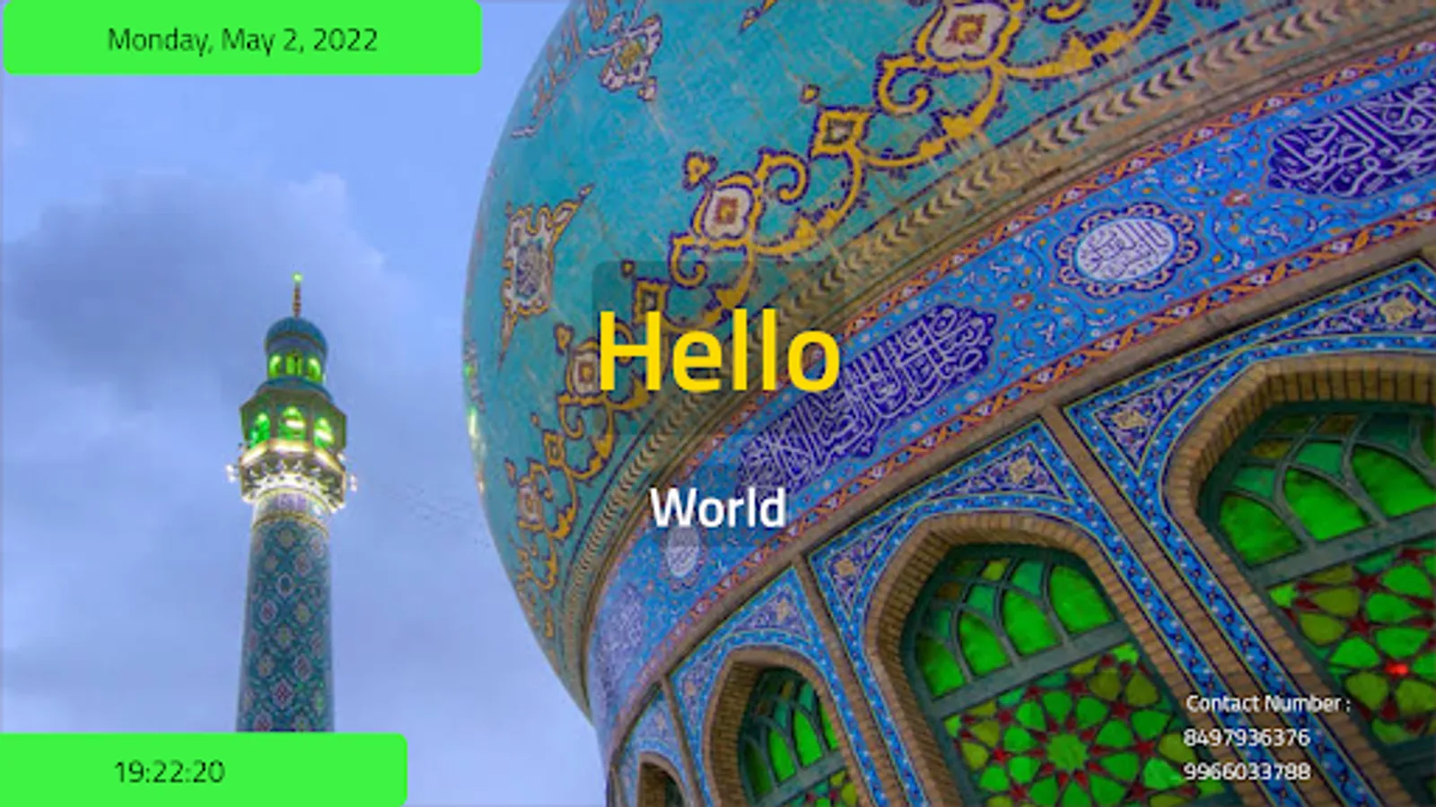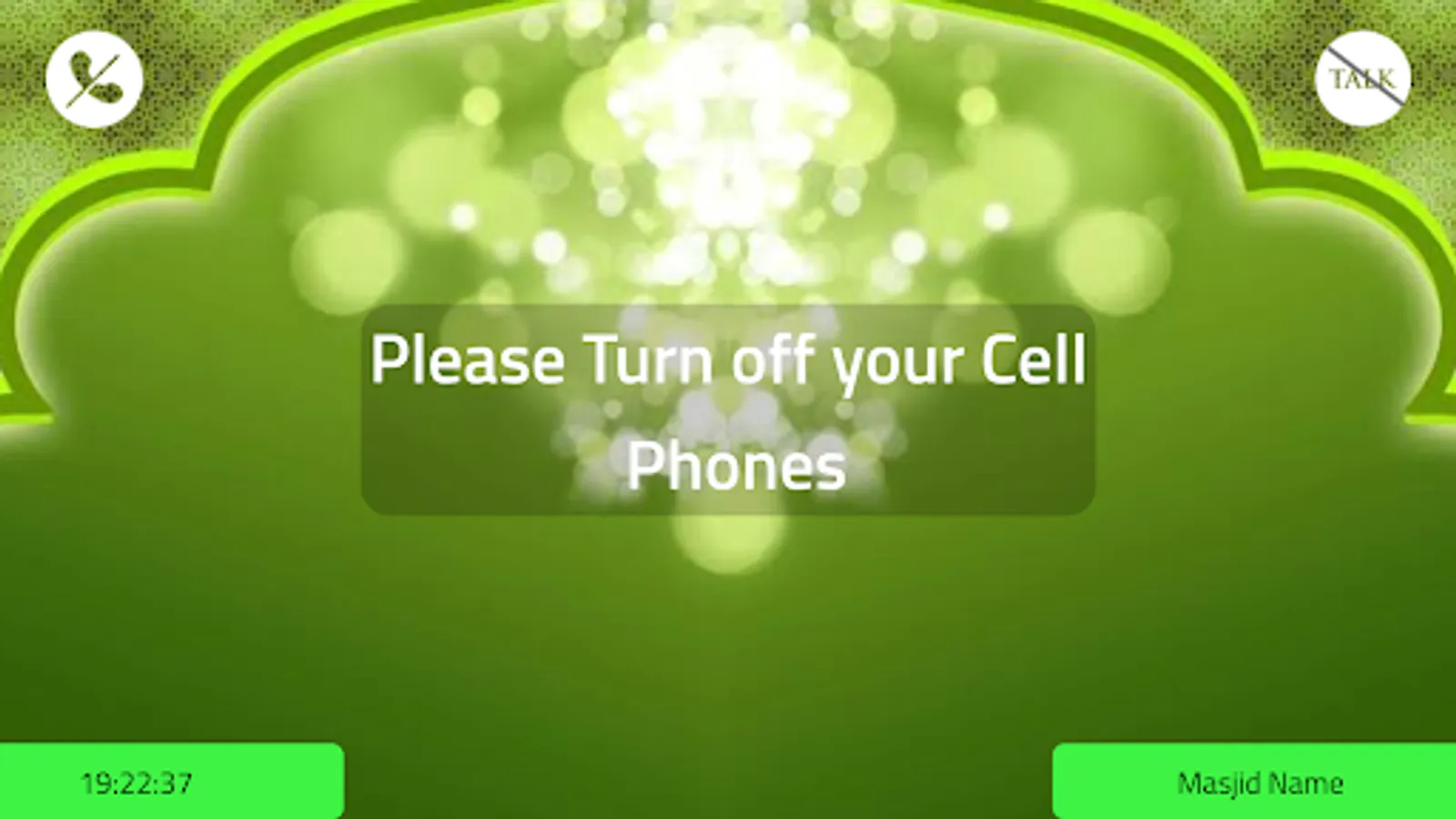 Application consists of multiple screen on a single TV which works as slides and apart from the namaaz timmings other information related to the masjid can also be displayed like committee details with names and events of special occasion ,speeches jumah kutbah discription etc.