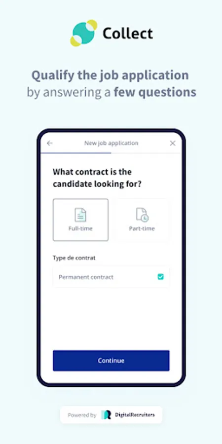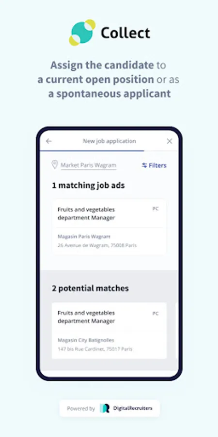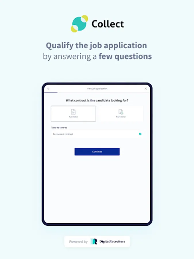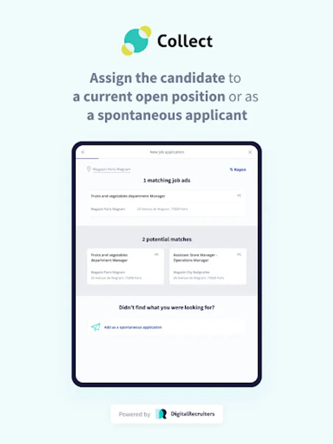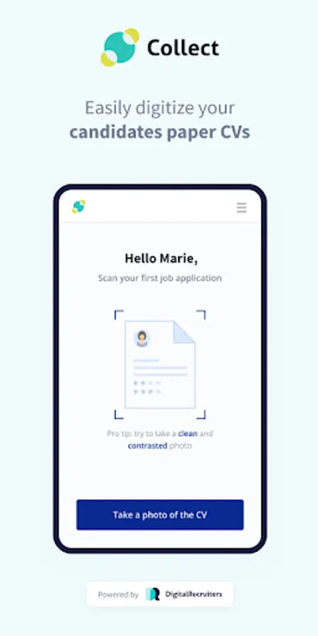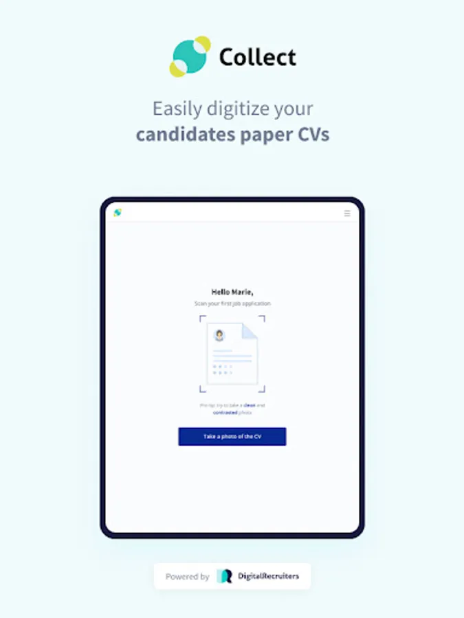 This app “Collect” is an extension of the DigitalRecruiters software, and allows you to digitize the paper CVs of candidates in a few seconds and to automatically inject them into your DigitalRecruiters space to treat them as any other job application, without any retyping!
