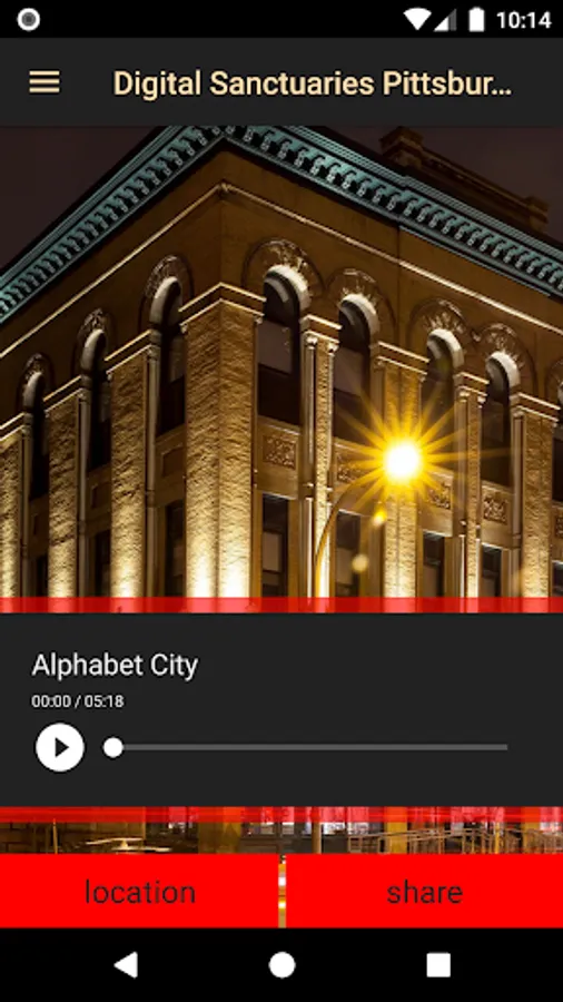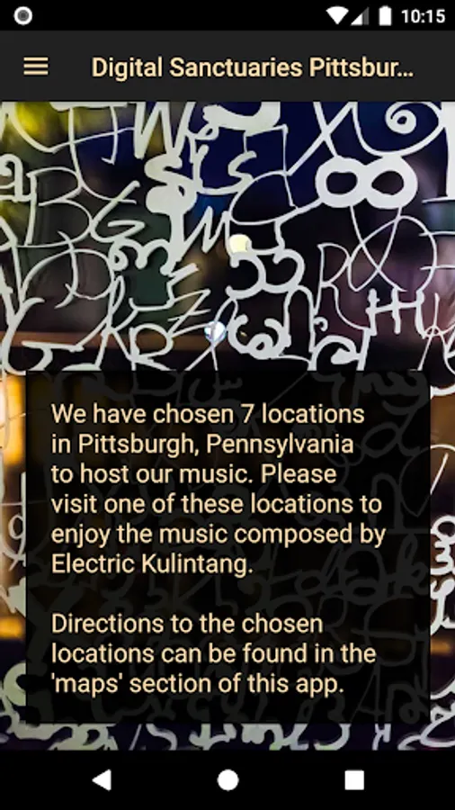 Digital Sanctuaries combines original music by Electic Kunlintang (Ibarra and Rodriguez) with poetry and short texts chosen by City of Asylum Pittsburgh. The app is interactive, allowing users to remix the music while they listen. It invites the public to re engage with the built environment of a cityscape. Digital Sanctuaries invites people to walk the sites, listen to music, and post their experiences.