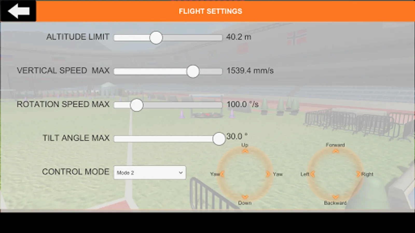 Settings are reduced to the most import ones for the simulator: max. altitude, max. vertical speed, max. rotation speed, max. tilt (controls the max. forward speed)