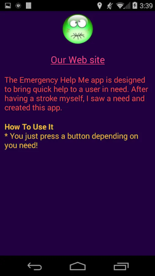 Emergency Help Me call or text was written after having a stroke myself. I saw the need for simple application where the person in emergency could press a button and call and/or text for help.