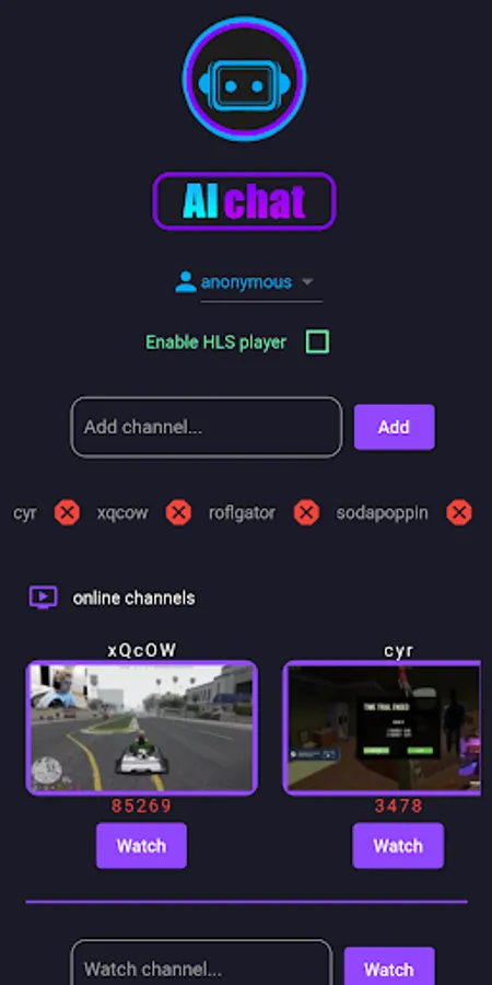 Absolutely unique chat bot for twitch, with following features : machine learning bot, static text bot, custom profiles, integrated HLS player and support of emotes and gifs from BTTV, 7TV, FFZ.