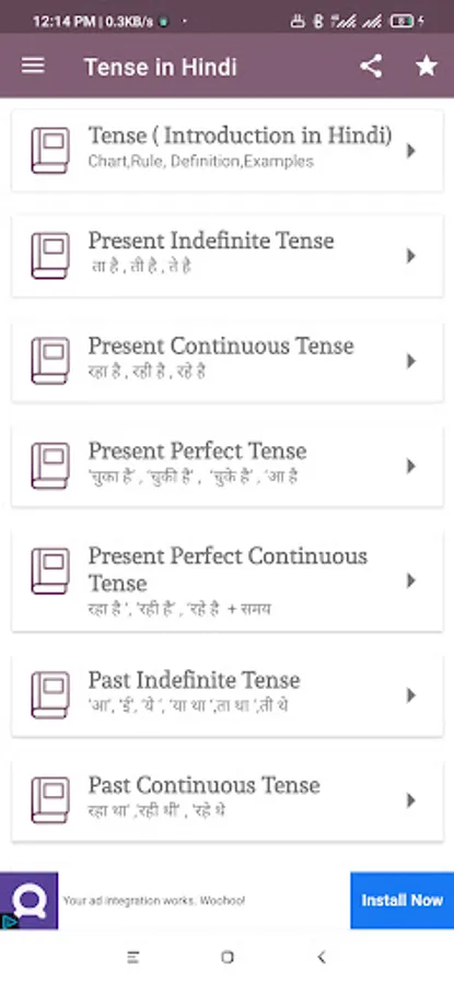 This is the best app for learning Tense . Tense are most important part of spoken English and English Grammar. This App contains all tense Structure , Definition , Rules and a lot of Examples.