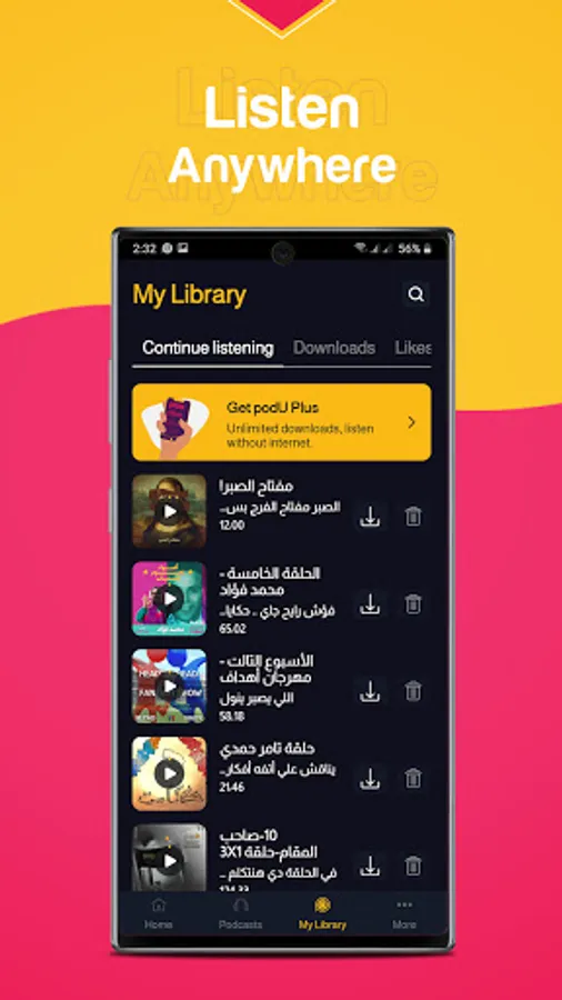You listen to your favorite podcast in the native Egyptian dialect anytime and anywhere. We use podU while on the road, in the gym, and while browsing our social media at night... Even better, the app uses so little mobile data that makes it the ultimate on-the-go and the on-demand companion!