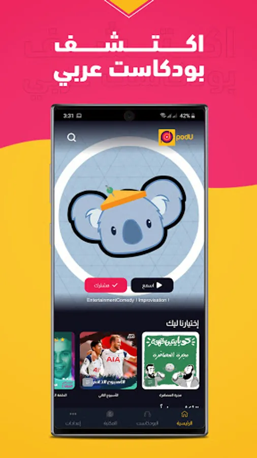 podU is the first platform for Arabic podcasts. You can play dozens of free podcasts from different genres. You can listen to podcasts on sports, Comedy, fantasy football, soccer, crime, history, and many more genres!
