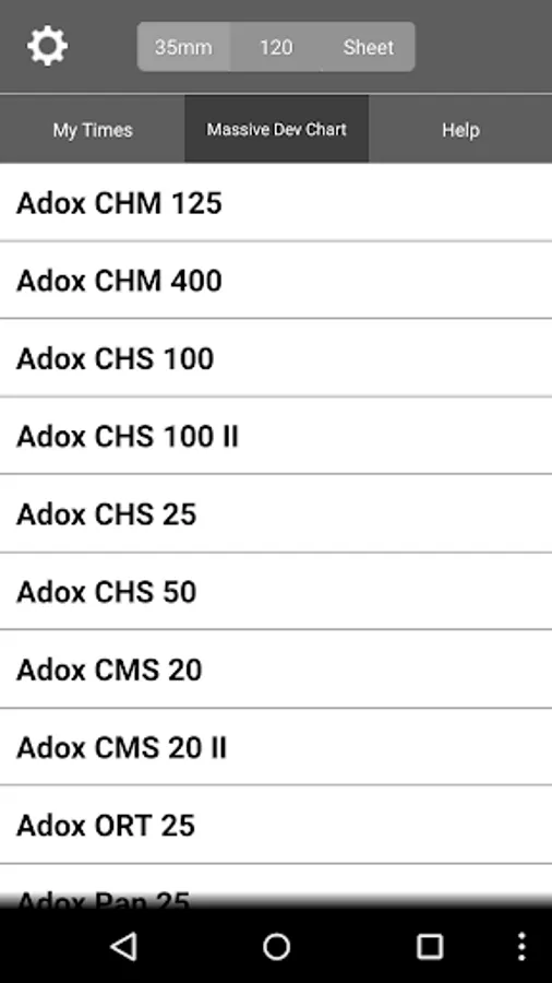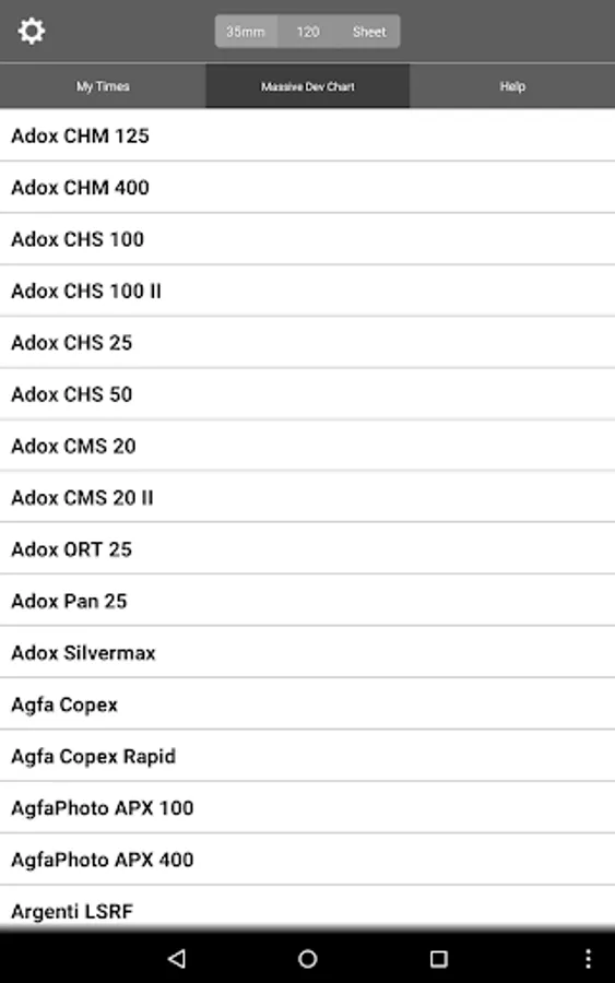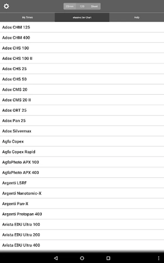 The #1 app for B&W film developing. The Massive Dev Chart Timer combines an advanced multi-step darkroom timer with an offline copy of the world's largest database of B&W film development times; maintained online since 1995 and currently including over 18,000 unique tried and tested entries unavailable elsewhere. If you are looking for a film developer timer, then there is no rival thanks to its advanced darkroom pro feature set, full customizability and superior performance.