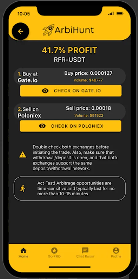 Live Arbitrage Tracking: ArbiHunt constantly scans 12+ of the top cryptocurrency exchanges, ensuring you receive instant alerts when arbitrage opportunities arise. Take advantage of these opportunities to buy low on one exchange and sell high on another, maximizing your profits.
