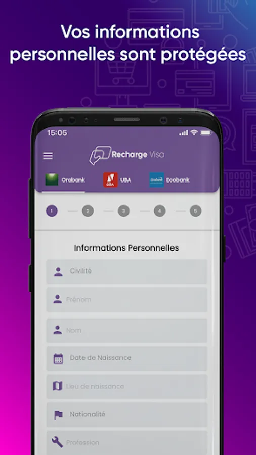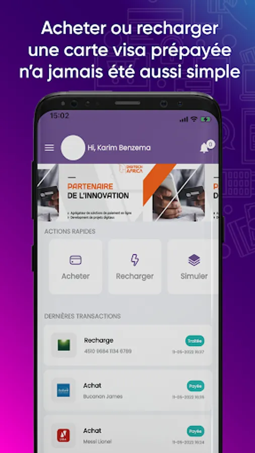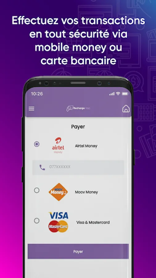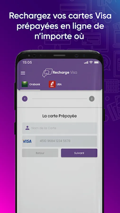 Mobile application of the Recharge Visa by Digitech Africa platform. Application allows to make purchases of Orabank, UBA and Ecobank prepaid cards. It is also possible to top up for Orabank and soon UBA & Ecobank.
