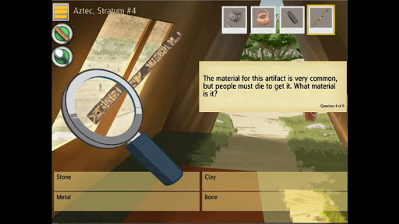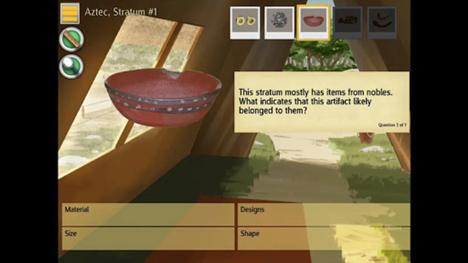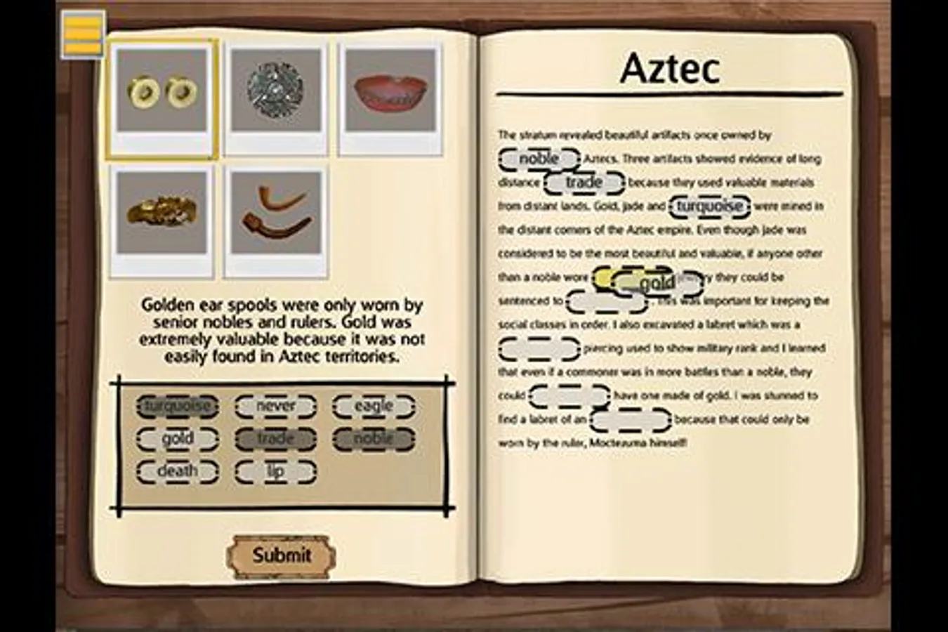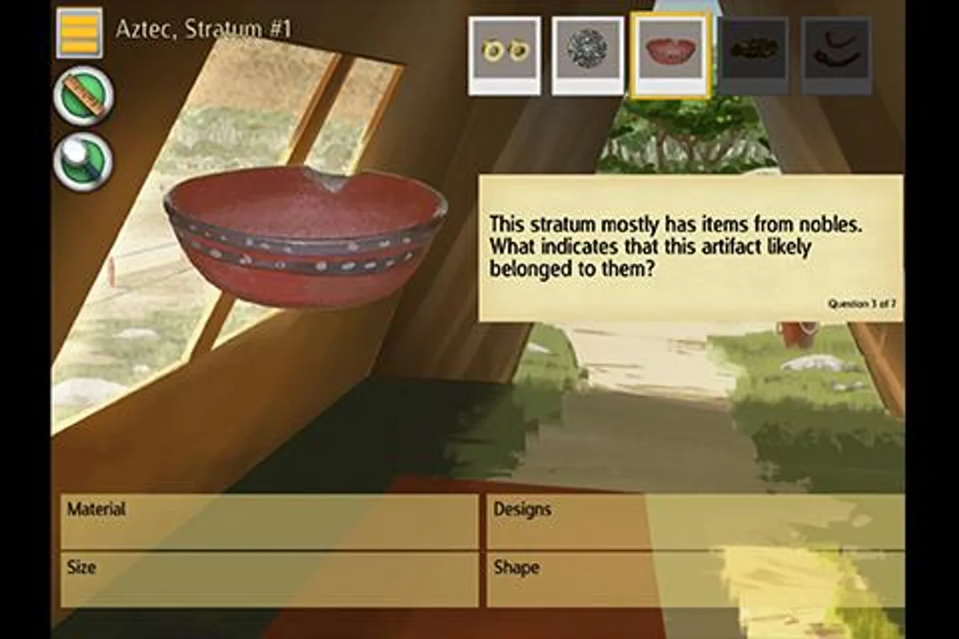 Players can explore the sites in any order; progress is recorded in journals that log collected artifacts, field notes and achievements. Throughout the game, players use C3 skills to analyze and make connections. They carefully deduct the facts about each area, stratum by stratum and artifact by artifact. At each location, players make meaning of how artifacts were used through a series of analysis questions and reports that require players to make connections, read closely and consider the historical context of the primary source artifacts. Finally, players see each site come alive as artifacts populate an historically accurate image of Mesoamerican life.