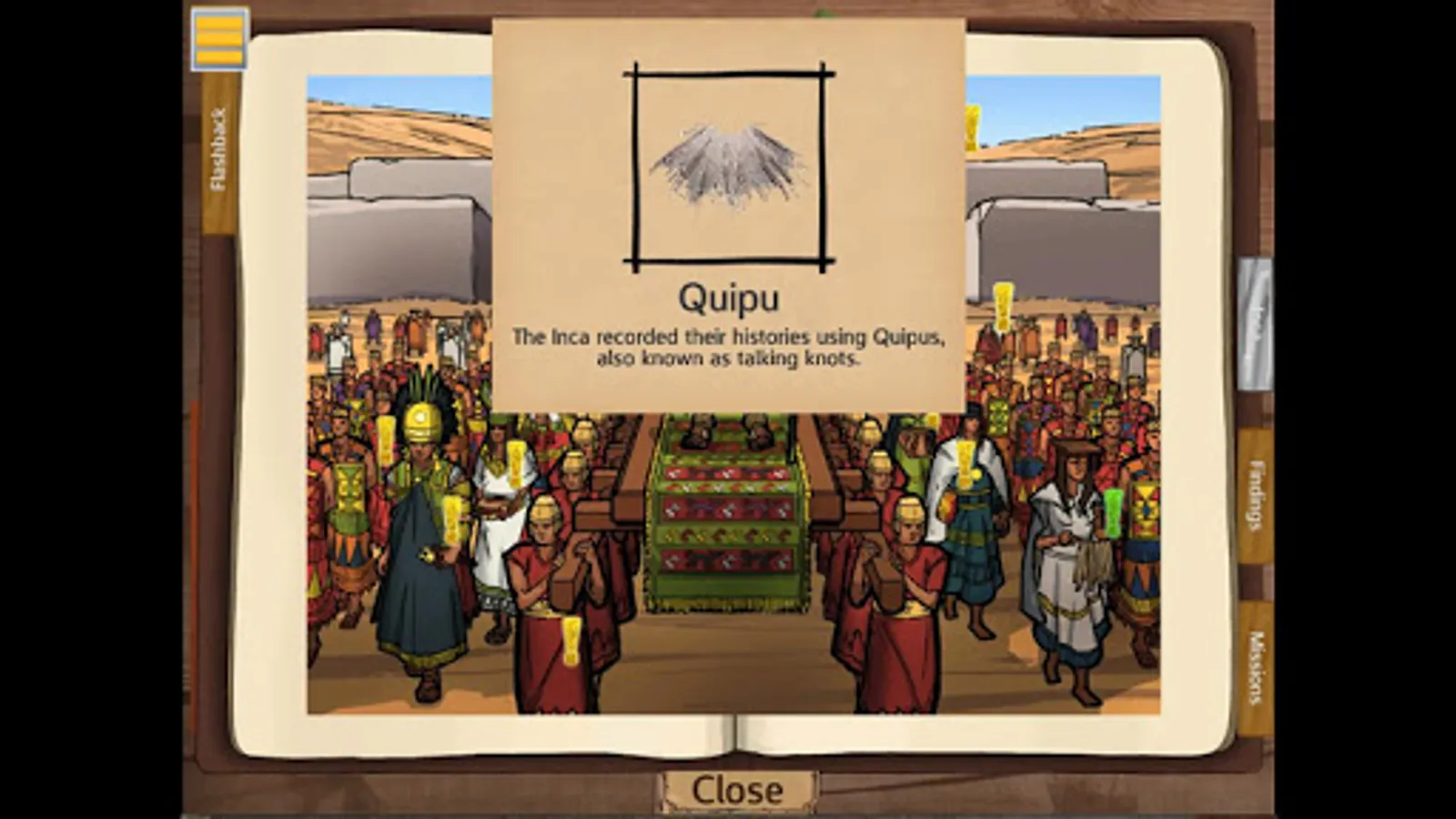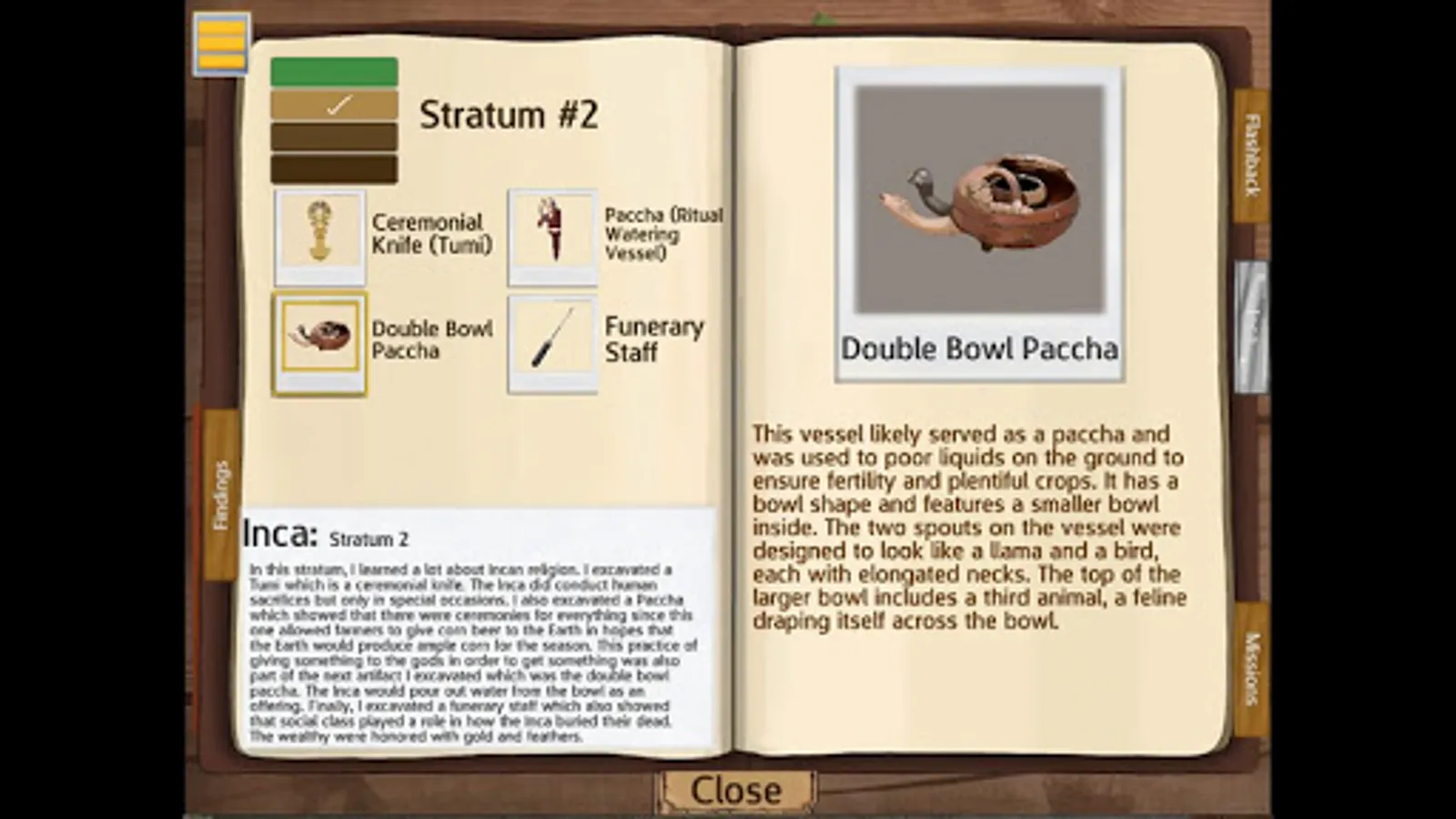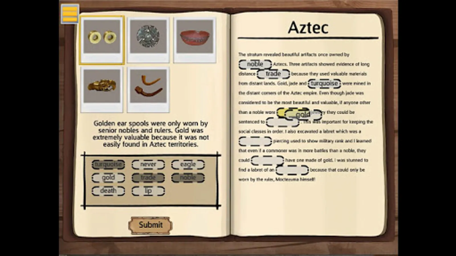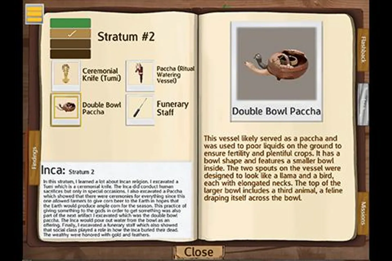 Players can explore the sites in any order; progress is recorded in journals that log collected artifacts, field notes and achievements. Throughout the game, players use C3 skills to analyze and make connections. They carefully deduct the facts about each area, stratum by stratum and artifact by artifact. At each location, players make meaning of how artifacts were used through a series of analysis questions and reports that require players to make connections, read closely and consider the historical context of the primary source artifacts. Finally, players see each site come alive as artifacts populate an historically accurate image of Mesoamerican life.