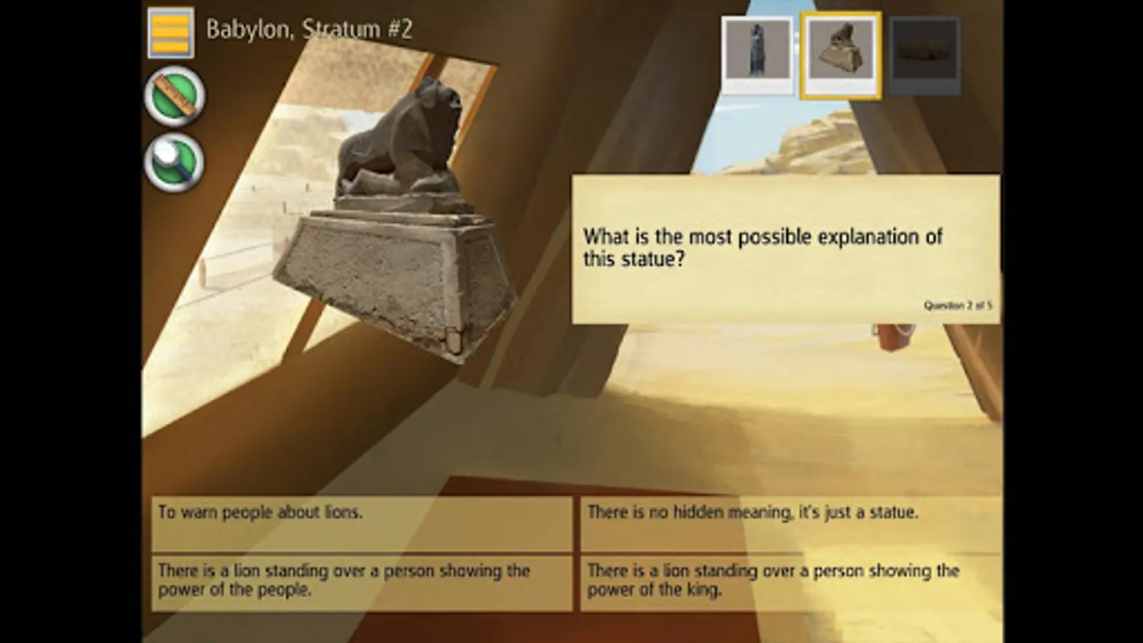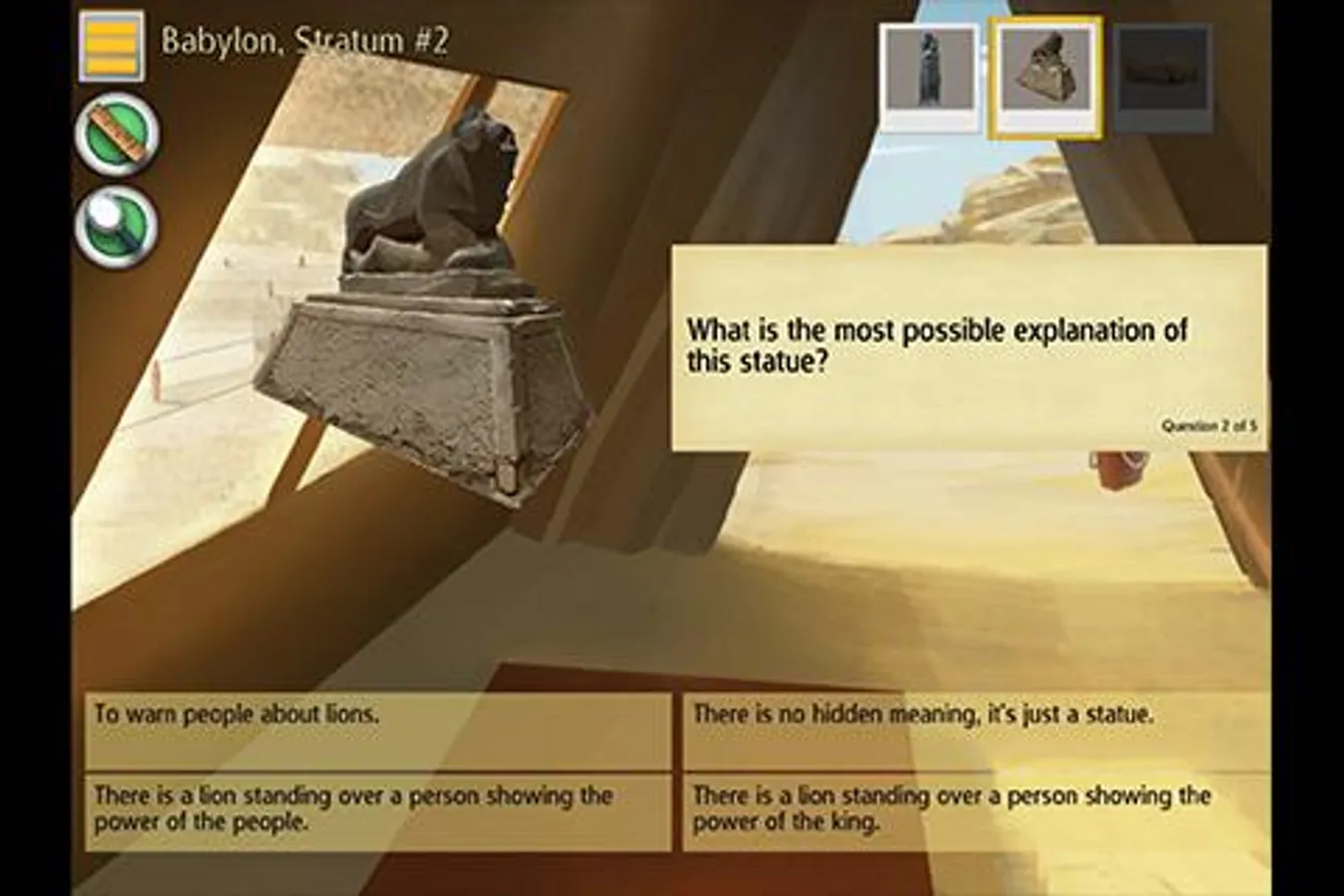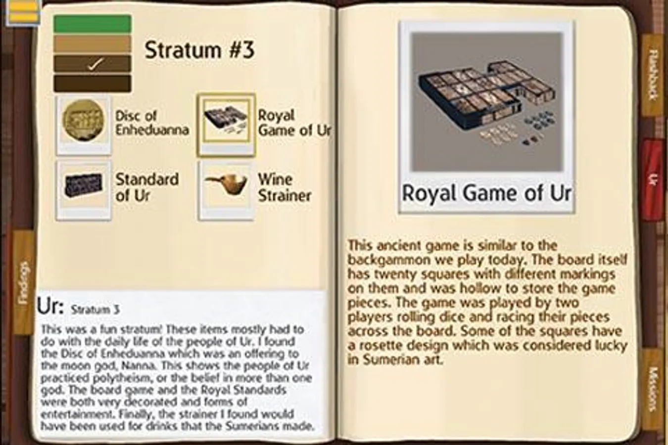 Players can explore the sites in any order; progress is recorded in journals that log collected artifacts, field notes and achievements. Throughout the game, players use C3 skills to analyze and make connections. They carefully deduct the facts about each area, stratum by stratum and artifact by artifact. At each location, players make meaning of how artifacts were used through a series of analysis questions and reports that require players to make connections, read closely and consider the historical context of the primary source artifacts. Finally, players see each site come alive as artifacts populate an historically accurate image of Mesopotamian life.