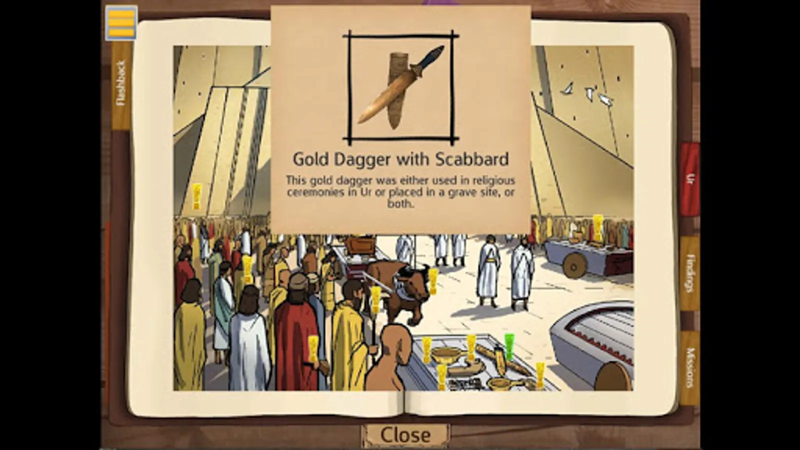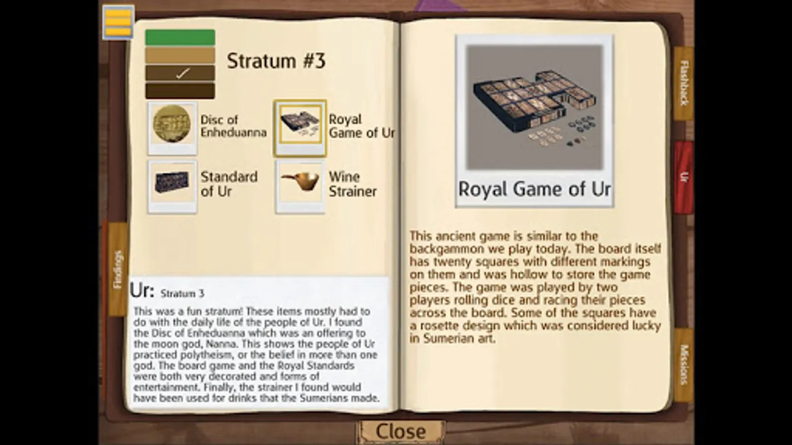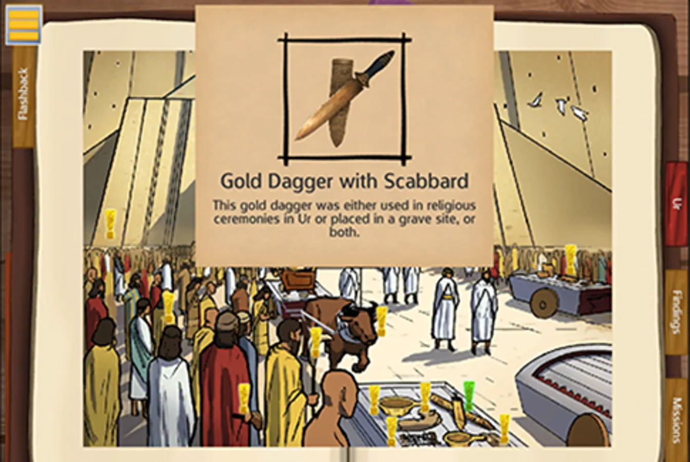 Players can explore the sites in any order; progress is recorded in journals that log collected artifacts, field notes and achievements. Throughout the game, players use C3 skills to analyze and make connections. They carefully deduct the facts about each area, stratum by stratum and artifact by artifact. At each location, players make meaning of how artifacts were used through a series of analysis questions and reports that require players to make connections, read closely and consider the historical context of the primary source artifacts. Finally, players see each site come alive as artifacts populate an historically accurate image of Mesopotamian life.
