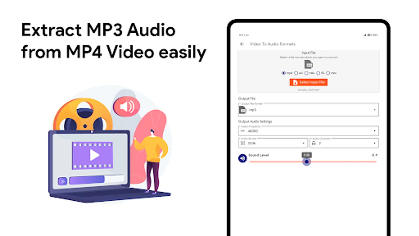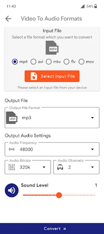 You can convert all popular Video File formats like MP4, AVI, MKV, MOV, FLV into Audio File formats like MP3, WAV, AAC OGG, FLAC, AIFF, AU etc..