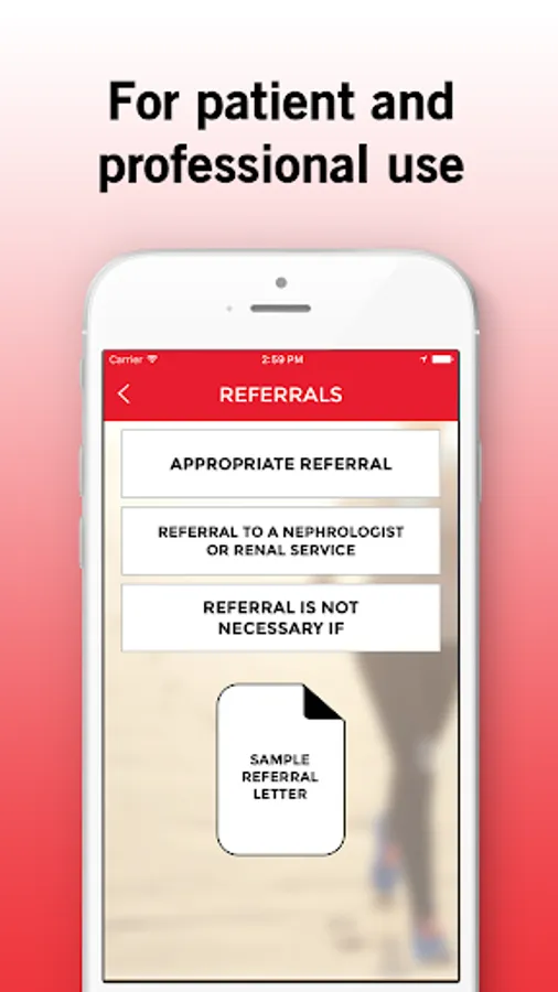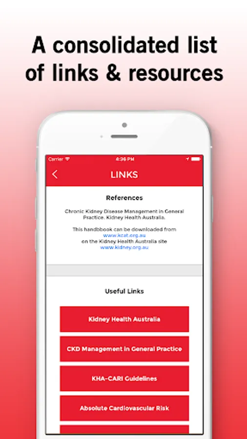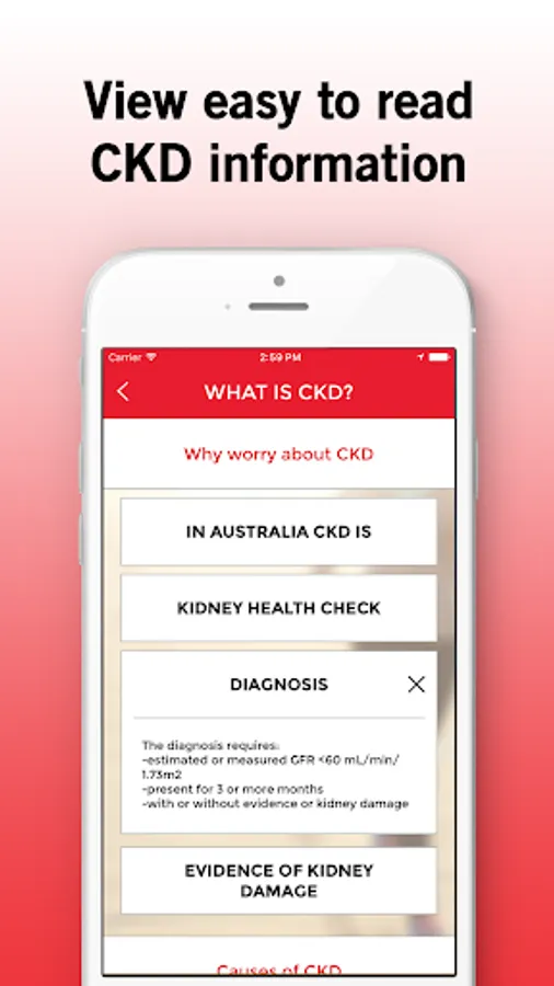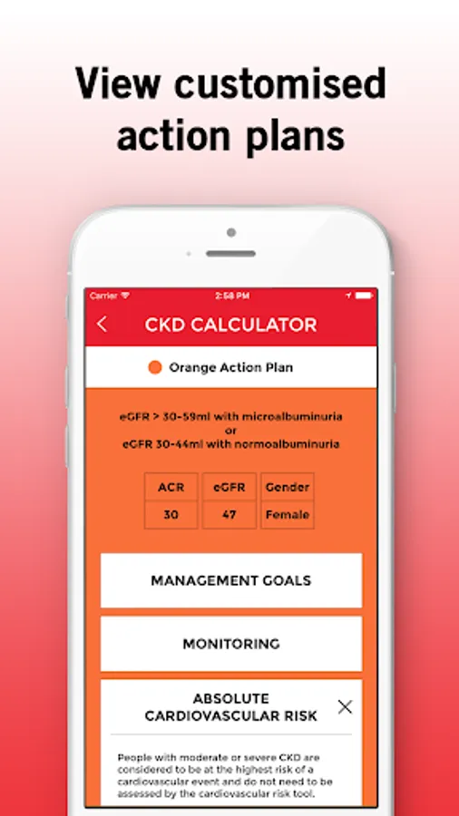 This app allows you to view a personalised action plan based on the eGFR and urine albumin:creatinine ratio. Action plans and staging criteria have been adapted from CKD Management in General Practice, Kidney Health Australia.