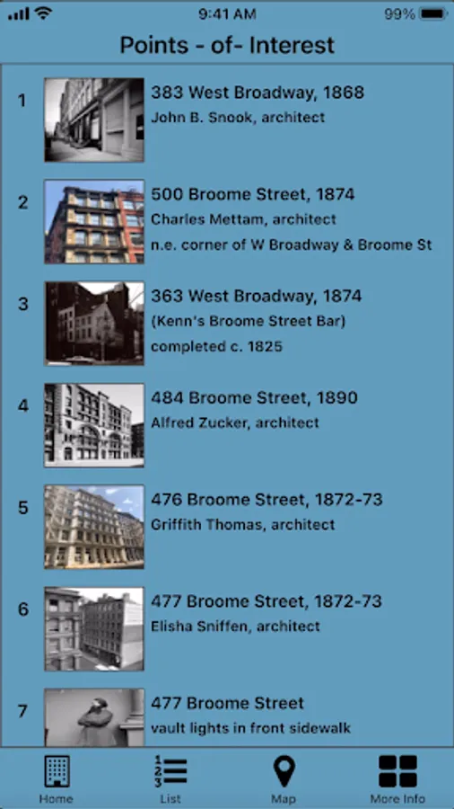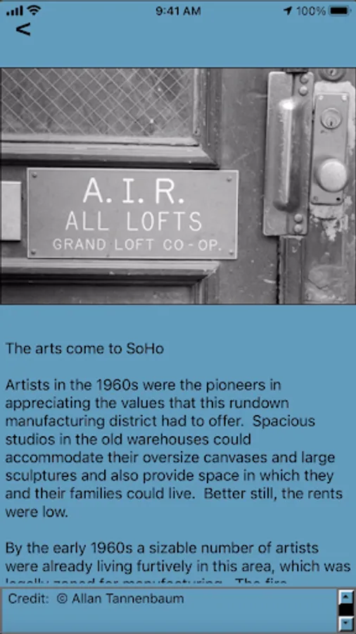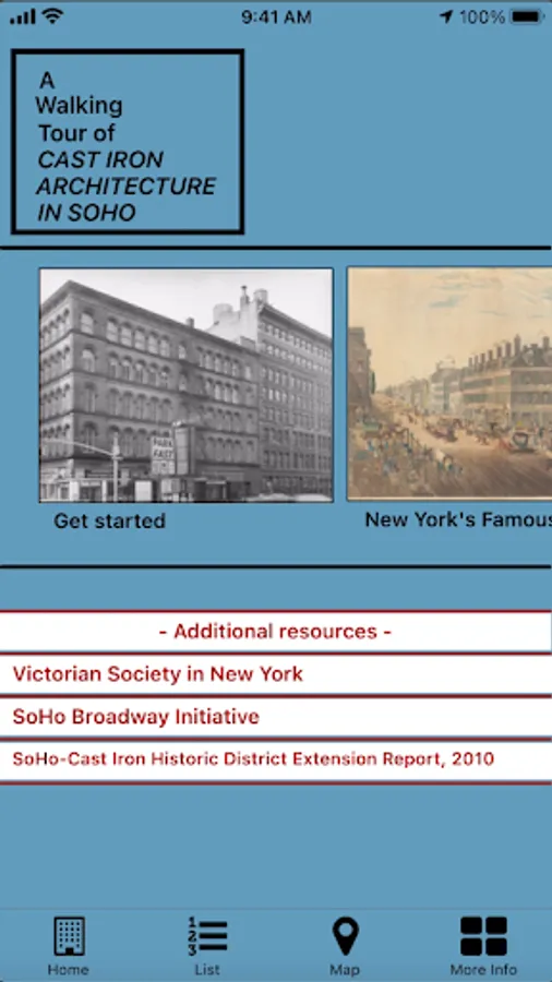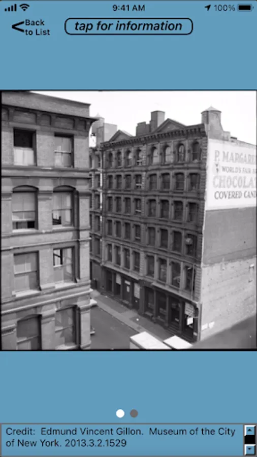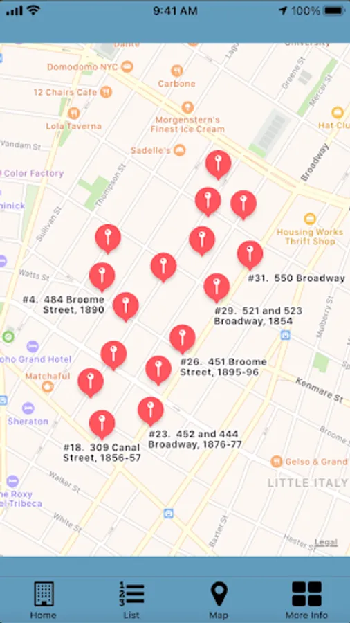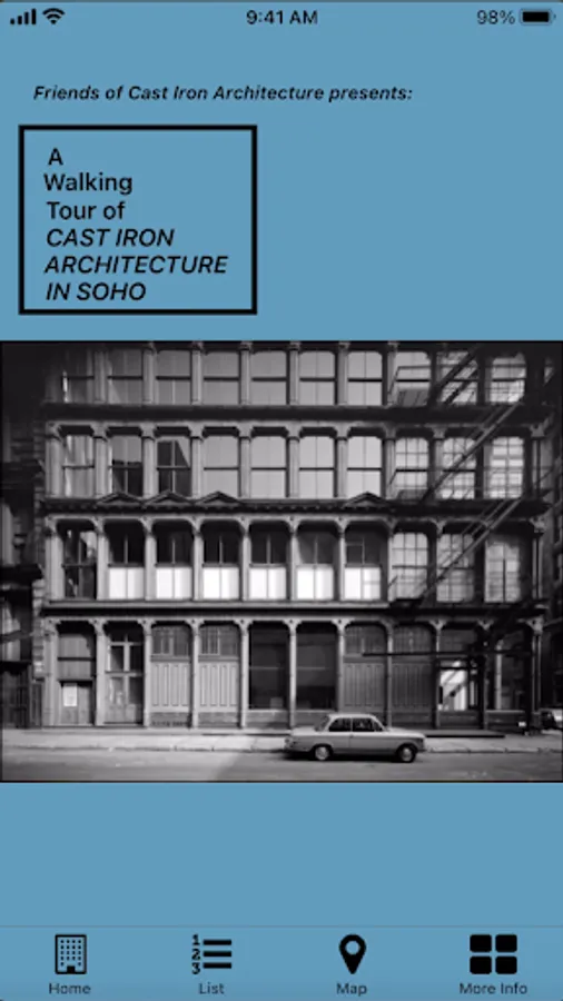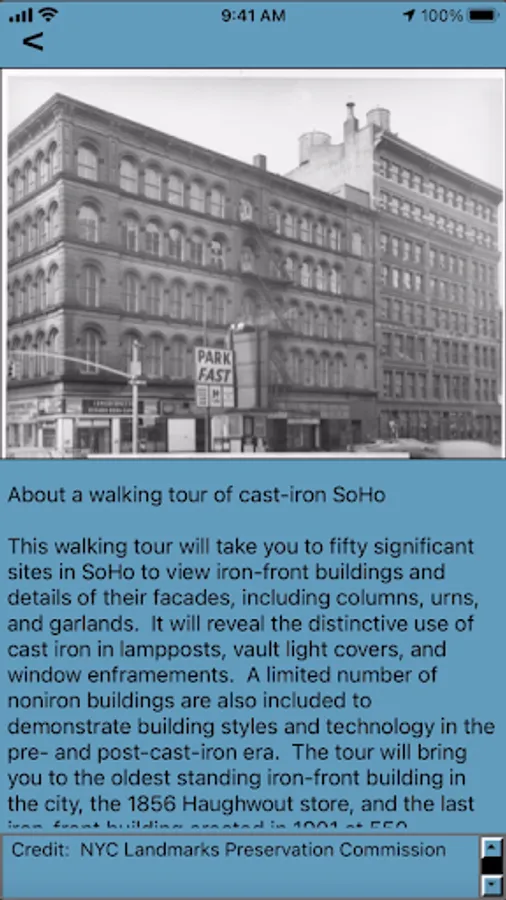 Enjoy a self-guided walking tour of the SoHo-Cast Iron Historic District. The app covers over 50 points-of-interest in an area where more iron-front buildings were built than were constructed anywhere else in the world. The points-of-interest on the tour are referenced by images from the photographs collection of the Museum of the City of New York, the New York Public Library and other collections.