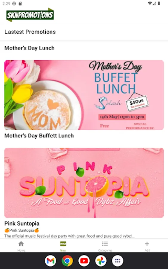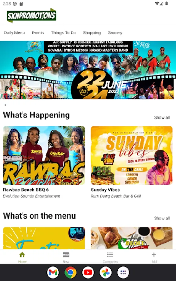 SKN Promotions is a mobile app developed in St. Kitts and Nevis that brings together local promotions and events in one convenient place. Whether you’re looking for daily menus, activities, services, or retail options, SKN Promotions has got you covered. With our app, you can easily access flyers and posters for all types of local promotions, eliminating the need to search through social media.