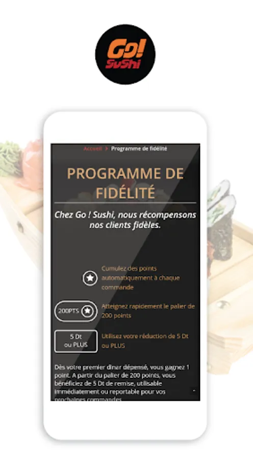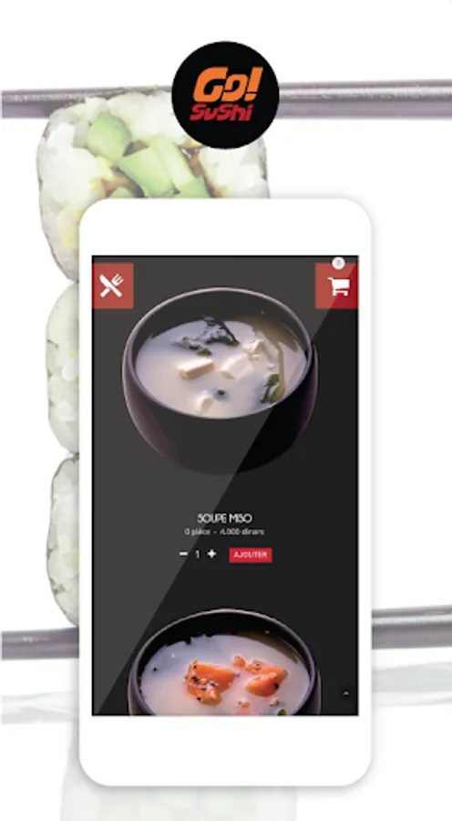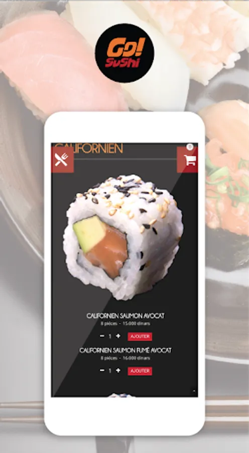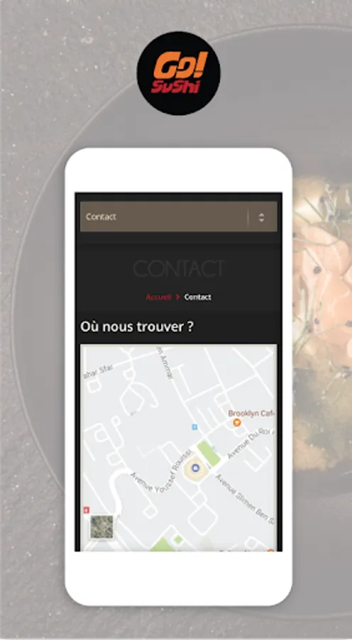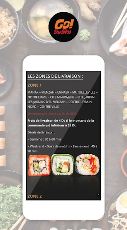 You will also find all the information on Go! Sushi (address, contact information, delivery areas, and presentation
