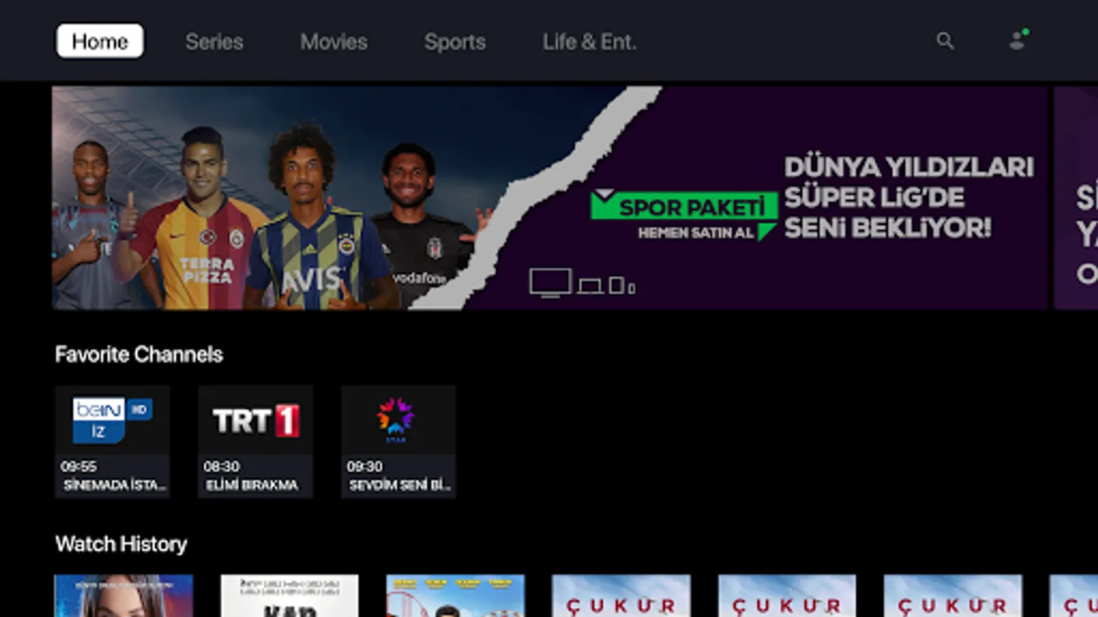 Turkey's most popular national channels, Turkey Super League and the League 1. league matches live, Watch again with the most watched television episodes you missed, enjoy watching Turkish movies. *