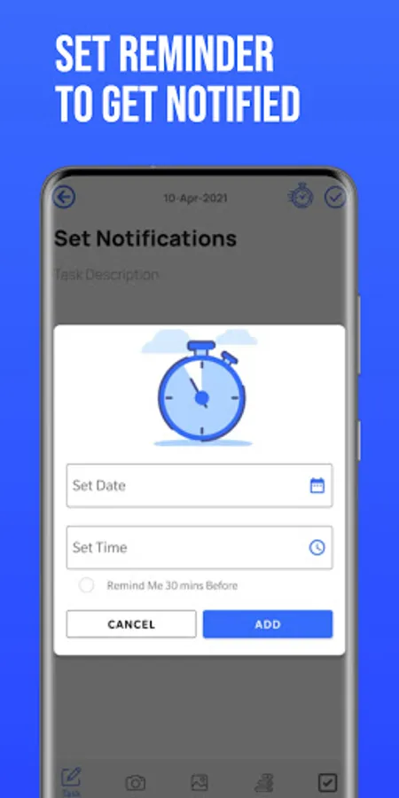 1. Task Capturing - You can start with "Task title" . It gives you an option to select the date and schedule time. The unique feature is that you can choose an option to notify 30 min before the scheduled time. This task can be further detailed out in two ways.