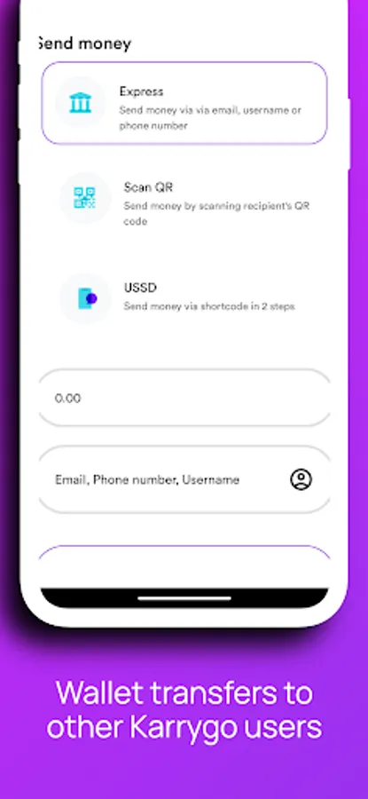 - Transfer money to other Karrygo wallet users either via Web, Mobile, or USSD.