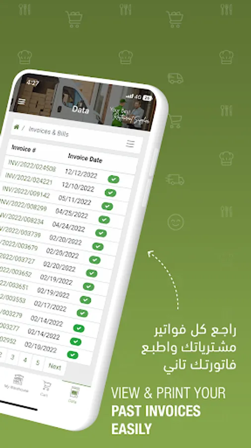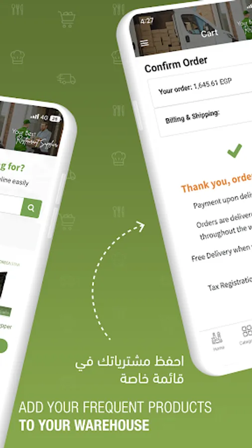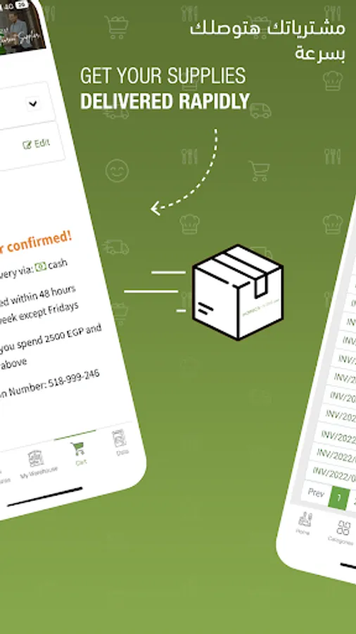 اطلب مشتريات مطعمك من بين مئات المنتجات المتوفرة، نمكنك من متابعة معاملاتك ومشترياتك وفواتيرك سواء تمت أونلاين من خلال الموقع أو الآبليكيشن أو من طرق أخرى (فريق المبيعات، خط دعم العملاء، الواتساب، الإيميل)
