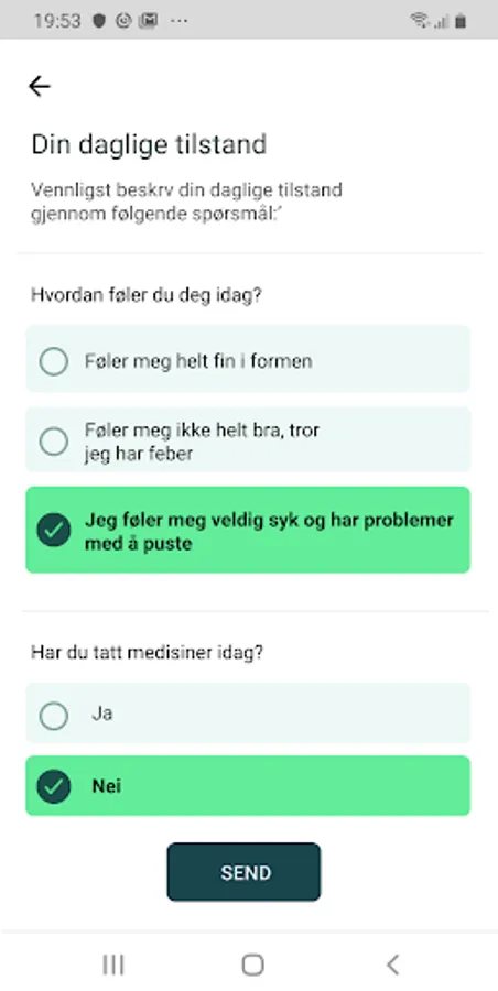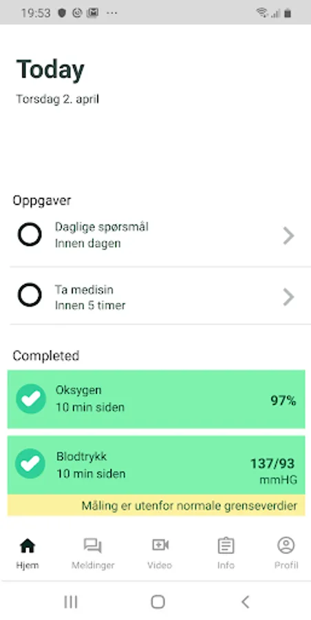 The patients get access to a patient app with personal tasks related to the patients health condition. The app is integrated with a large number of measuring devices, like for example blood pressure, spirometer, and pulse oximeter. Through a chat the patient can send messages, and healthcare professionals can answer in a timely matter. Video consultation can be arranged if needed.