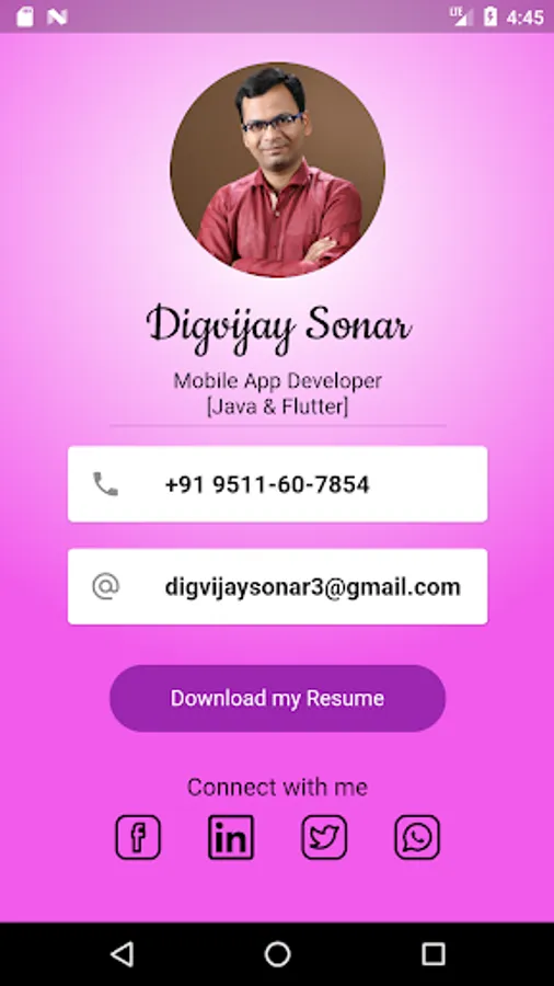 This is my profile app. This app contains my contact information, social media links, and my resume.
