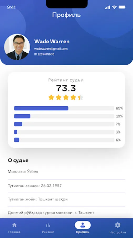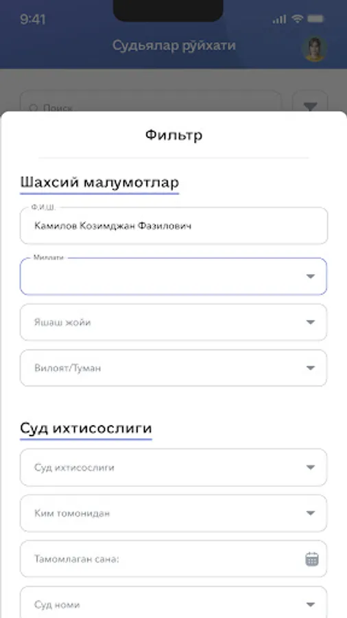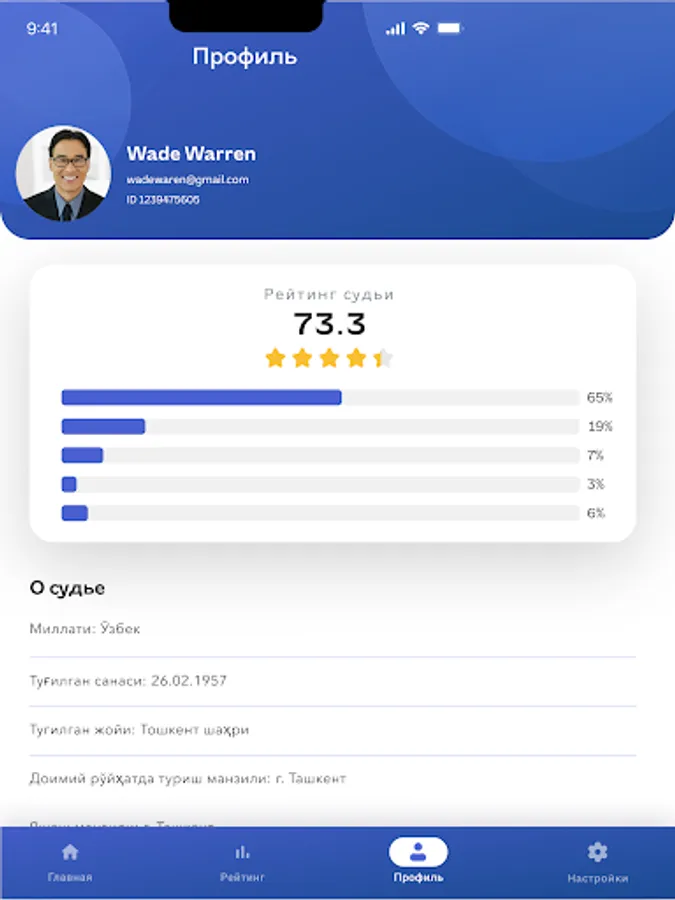 The E-Justice mobile application is designed to assess the performance of courts based on scientific approaches aimed at improving the position of the Republic of Uzbekistan in international ratings and indices of the judiciary, these indicators have already been implemented in evaluating the performance of courts based on an electronic program through which an online rating has been introduced courts and judges. The application allows you to evaluate and monitor the activities of judges, which will allow you to receive complete, objective and reliable information about the activities of judges, excluding the human factor, and ensure the complete independence of judges from court administrators.
