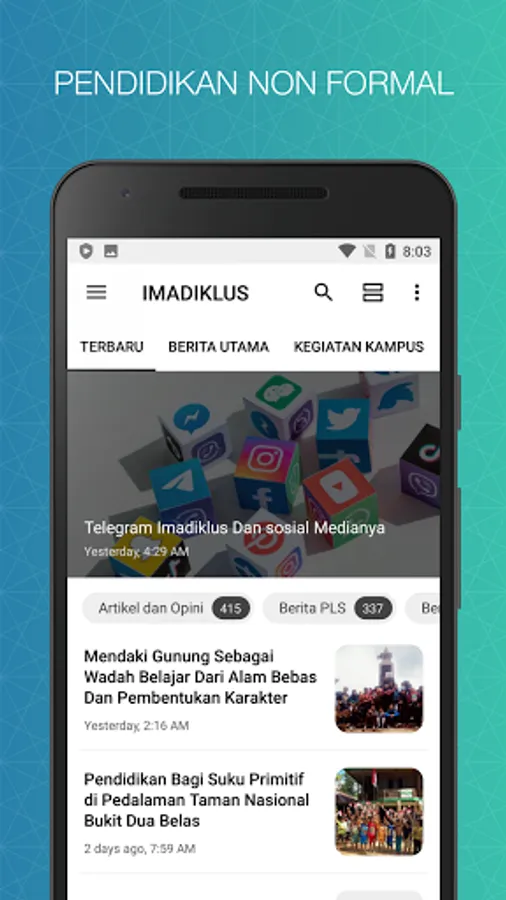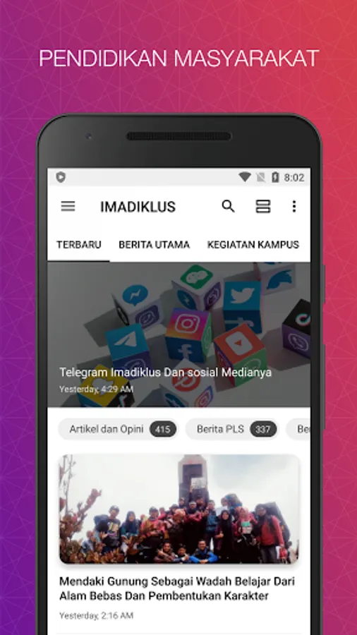 Imadiklus.or.id is a real action movement to socialize student activities, through writing about the PLS, PLS department events even to policies / programs and other government information to the whole community, especially those who are reached by the internet network. imadiklus.or.id is managed as an organization, without collaborating with any agency. However, in its implementation it becomes joint property, because anyone can participate in it, related to information related to Outside School Education, in addition, imadiklus.or.id also facilitates communication between PLS / PNF / PENMAS students and alumni from sharing regions throughout INDONESIA through the chat application. telegram-based, in order to exchange information related to kePLSan, with the aim of strengthening friendship and sharing information, imadiklus.or.id is expected to become an online facility related to PLS / PNF / PENMAS