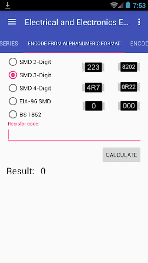 ✔ SMD resistor code calculator (Alpha-Numeric format, SMD 2, 3, 4 digit, EIA-96 and BS 1852)