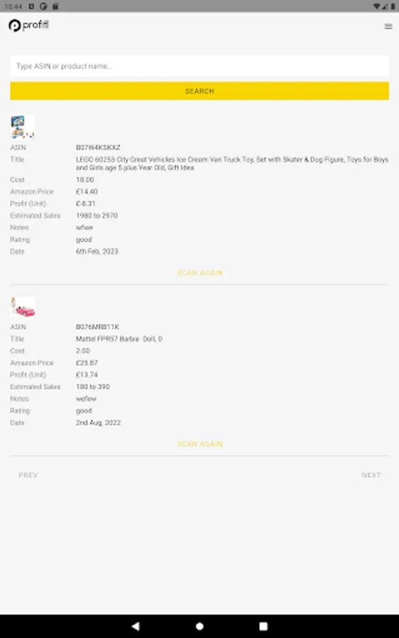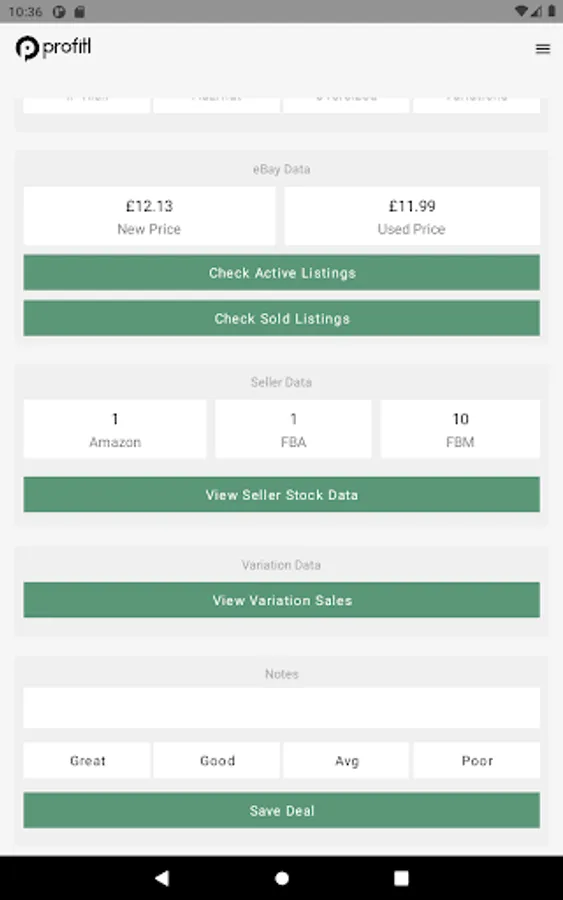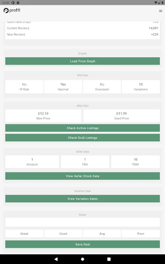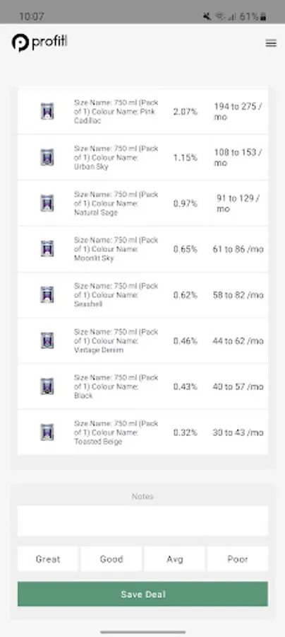 Save deal - save your notes, ratings and reviews in one click. You can come back to a product at any time in the "Saved Scans' section on the Profitl Website.