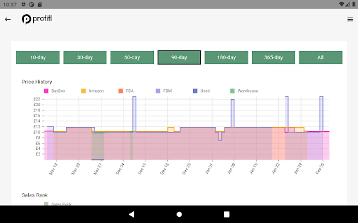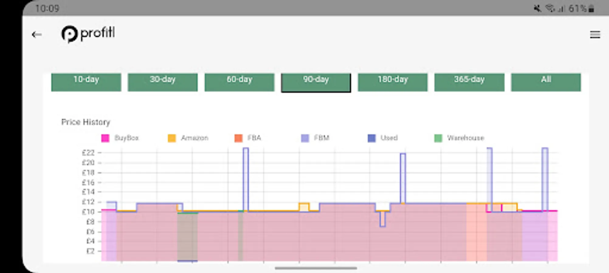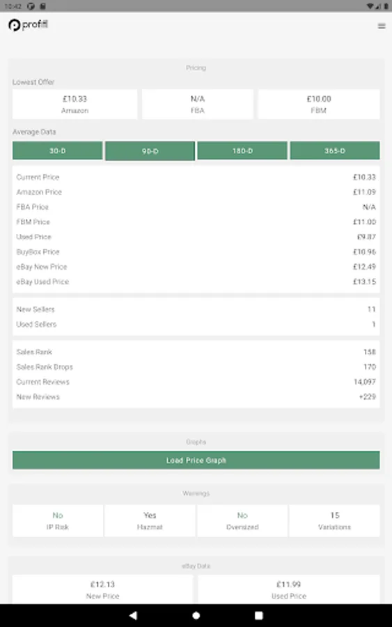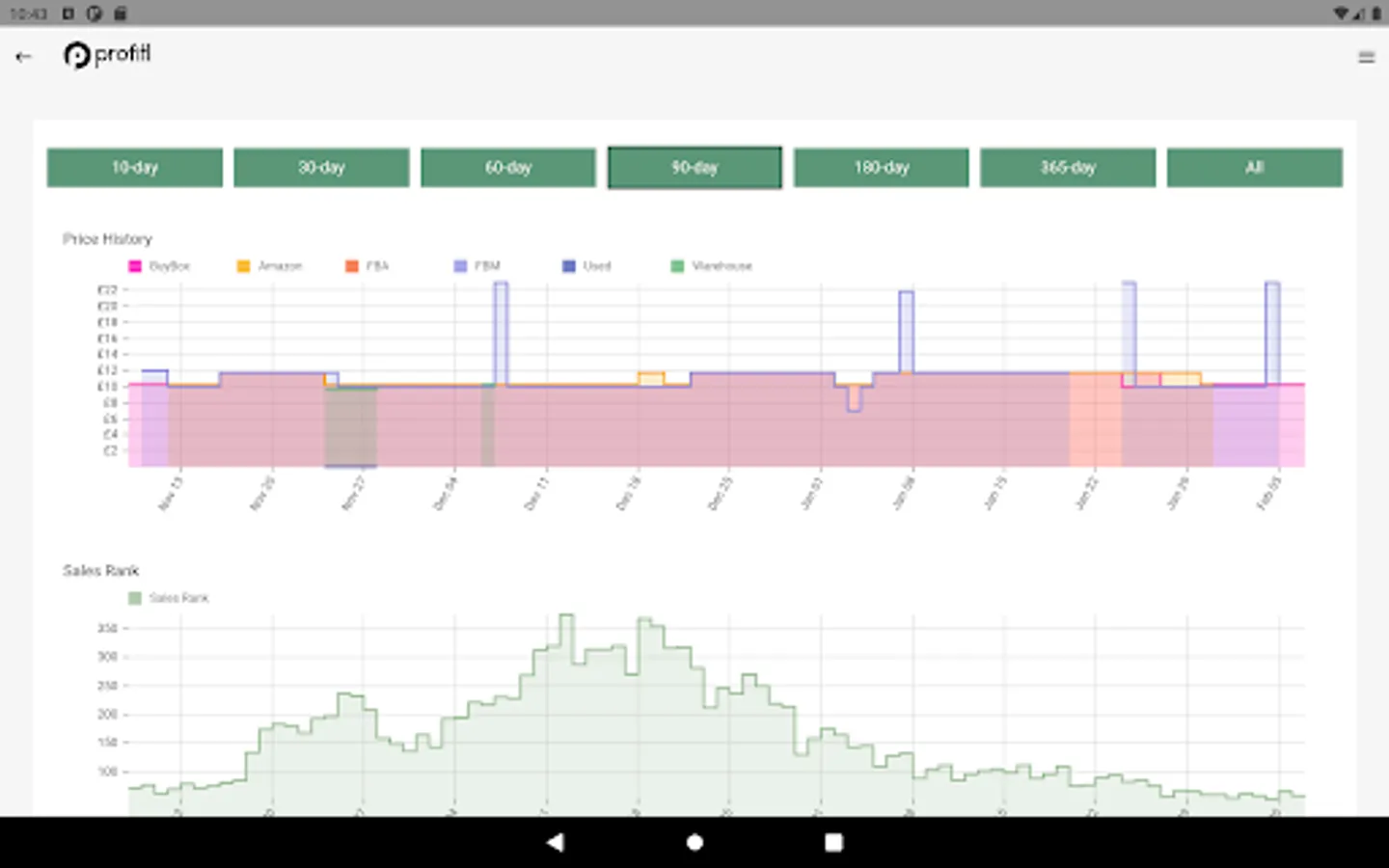 Product price graphs - with 90, 180 and 365 day graphs you can compare past pricing to determine the most and least you could sell a product for.